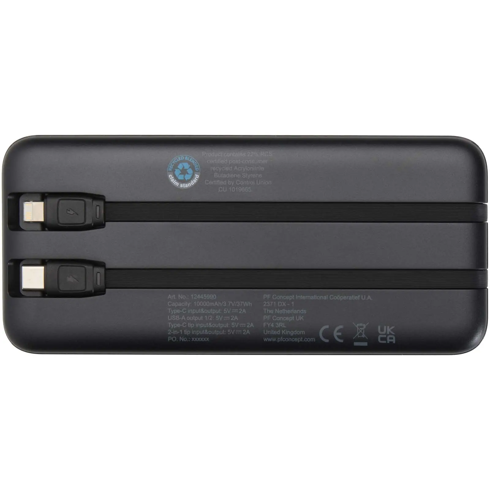 €11.37Adhil powerbank 10.000 mAh od reciklirane plastike s dva ugrađena kabela (Type-C i Lightning/microUSB), dva USB-A izlaza i Type-C ulaz/izlaz, LED indikator statusa punjenja