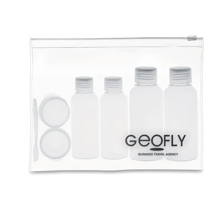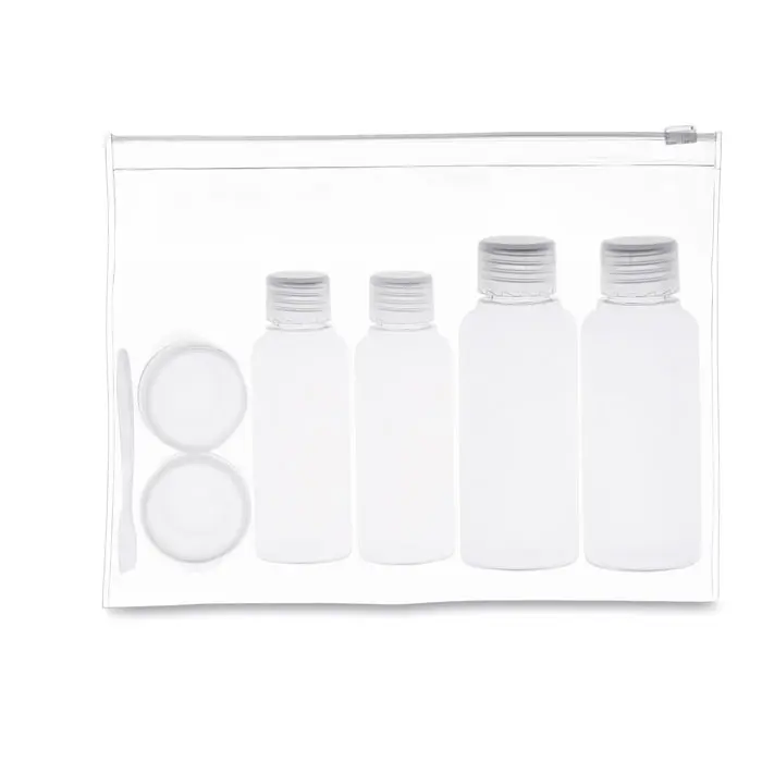 Plane travel pouch including 6 empty plastic bottles. (100ml, 50ml and 10ml)