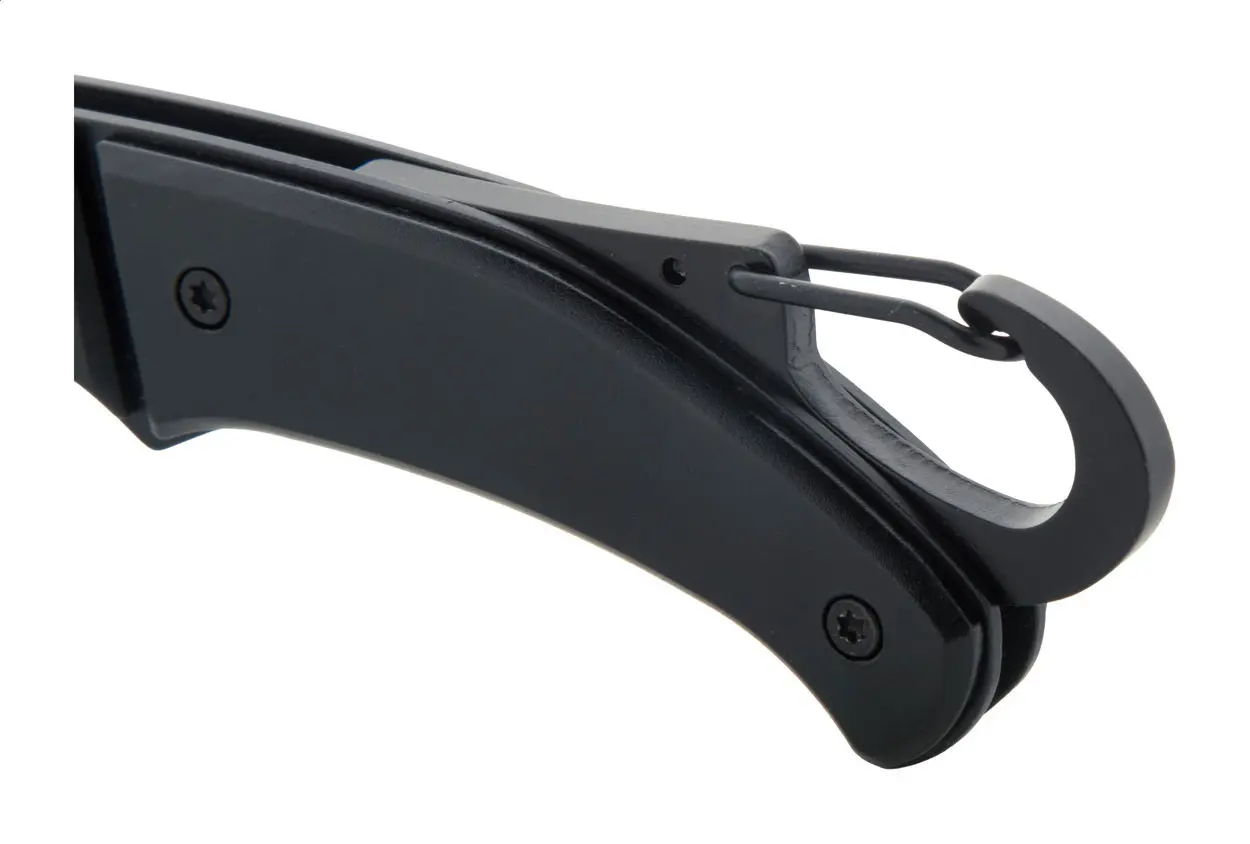 Džepni nož od nehrđajućeg čelika s aluminijskom drškom, karabinerom i sigurnosnom blokadom, crne boje