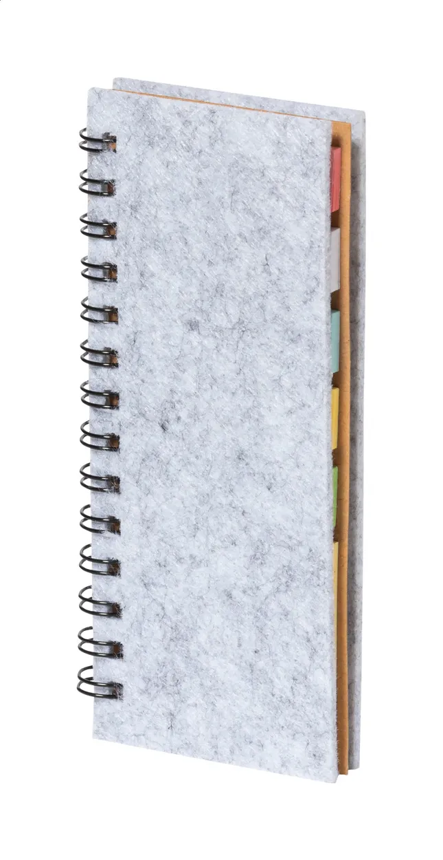 Spiralna bilježnica presvučena rPET filcom s 30 liniranih listova od recikliranog papira, 25 samoljepljivih papirića i 125 označivača stranica u 5 boja