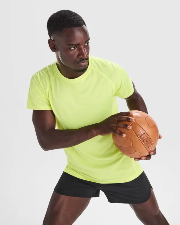 €4.29Prozračna tehnička majica s raglan rukavima, bočne panele s protukliznim šavovima, okrugli izrez u tonu i traka na vratu