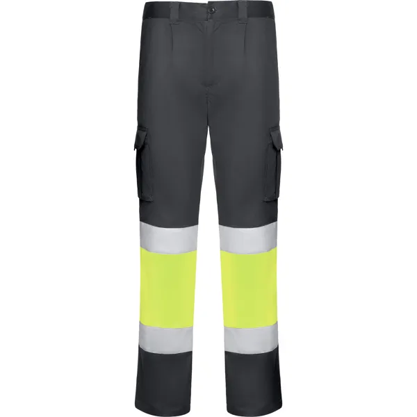 Hlače dugih nogavica s visokom vidljivošću u dvije boje s više džepova.·Izdržljiva tkanina koja se rasteže.·Struk s elastikom na stražnjoj strani.·Dva prednja džepa.·Dva stražnja džepa s preklopom i Velcro zatvaračem.·Dva cargo džepa s preklopom i Velcro zatvaračem.·Dvije reflektirajuće trake na nogavicama.·Vanjska Roly WRK etiketa.·Broj pranja: x25