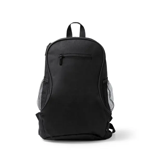 €4.75Ruksak od 300D RPET-a s glavnim i prednjim džepom s patentnim zatvaračem, podstavljenim ručkama i bočnim džepovima s mikroperforiranim dizajnom