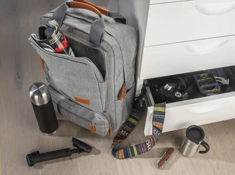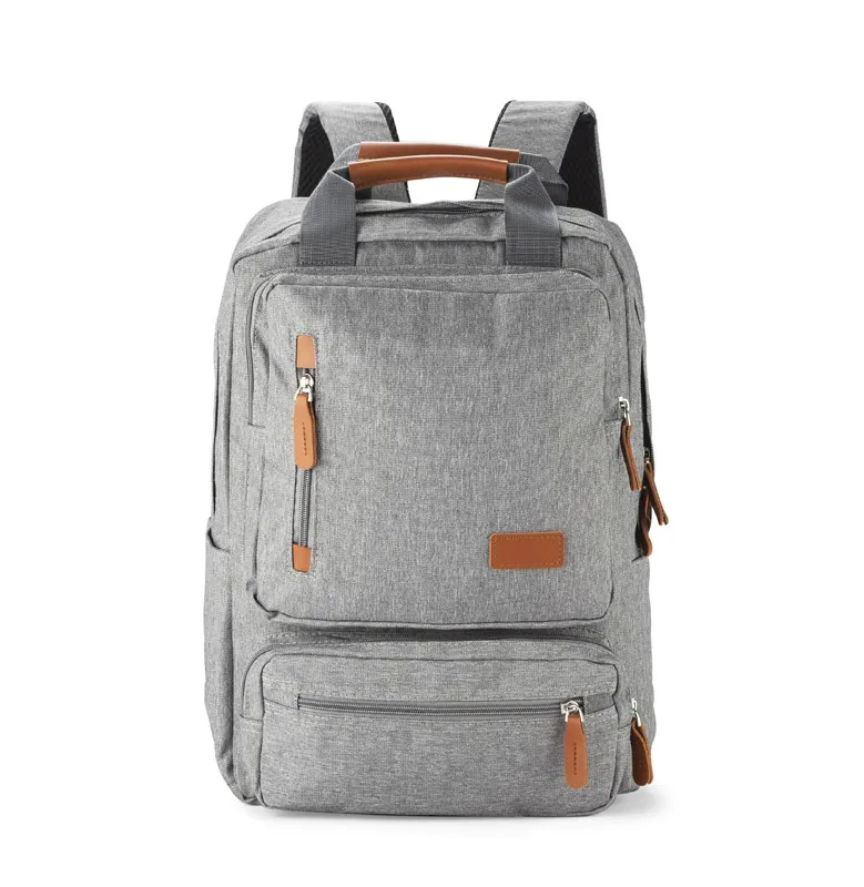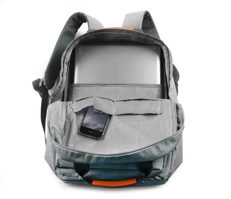 €32.73Jednokomorni PAKKU ruksak sive boje s elementima od eko kože ima pet unutarnjih i šest vanjskih džepova od kojih su četiri s patentnim zatvaračem i dva bočna džepa te dvije ručke ojačane eko kožom izrađen od 600D poliestera