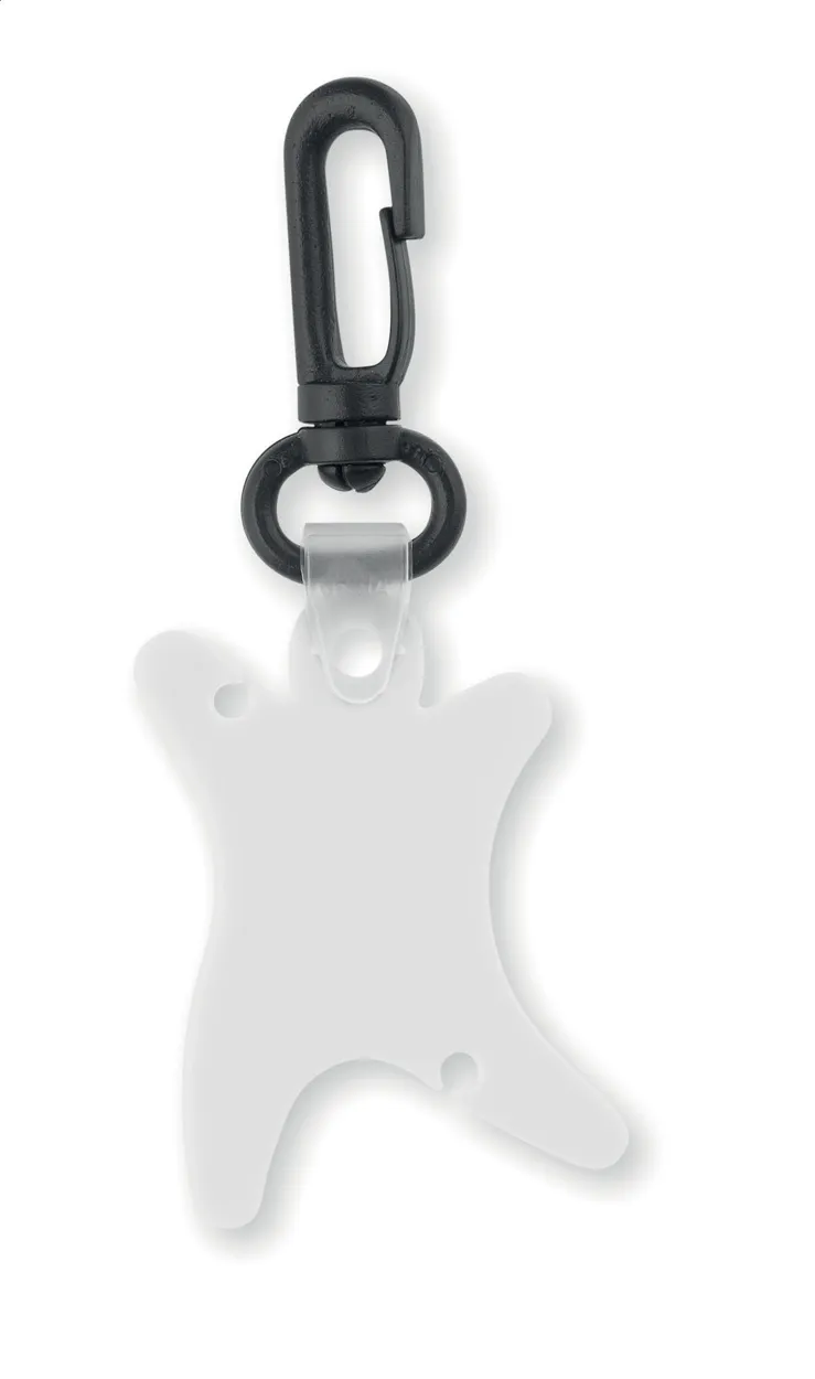 Plastični privjesak za ključeve s namotavačem za kabel slušalica i plastičnom karabinom.