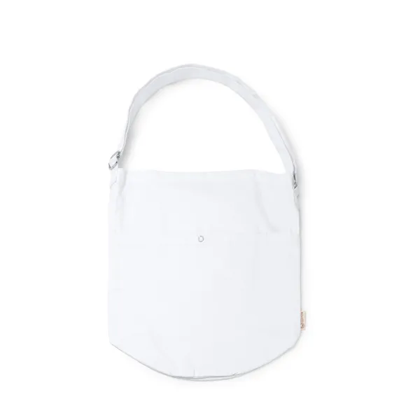 Torba napravljena od recikliranog pamuka težine 240 g/m² s prednjim džepom, zatvaranjem na gumb i unutarnjim džepom. Podesiva ručka.
