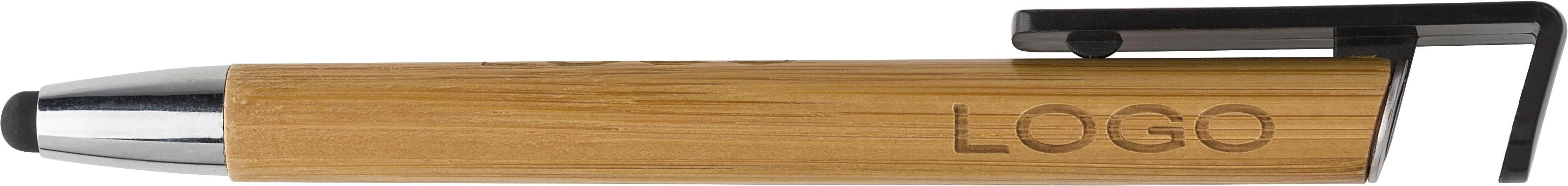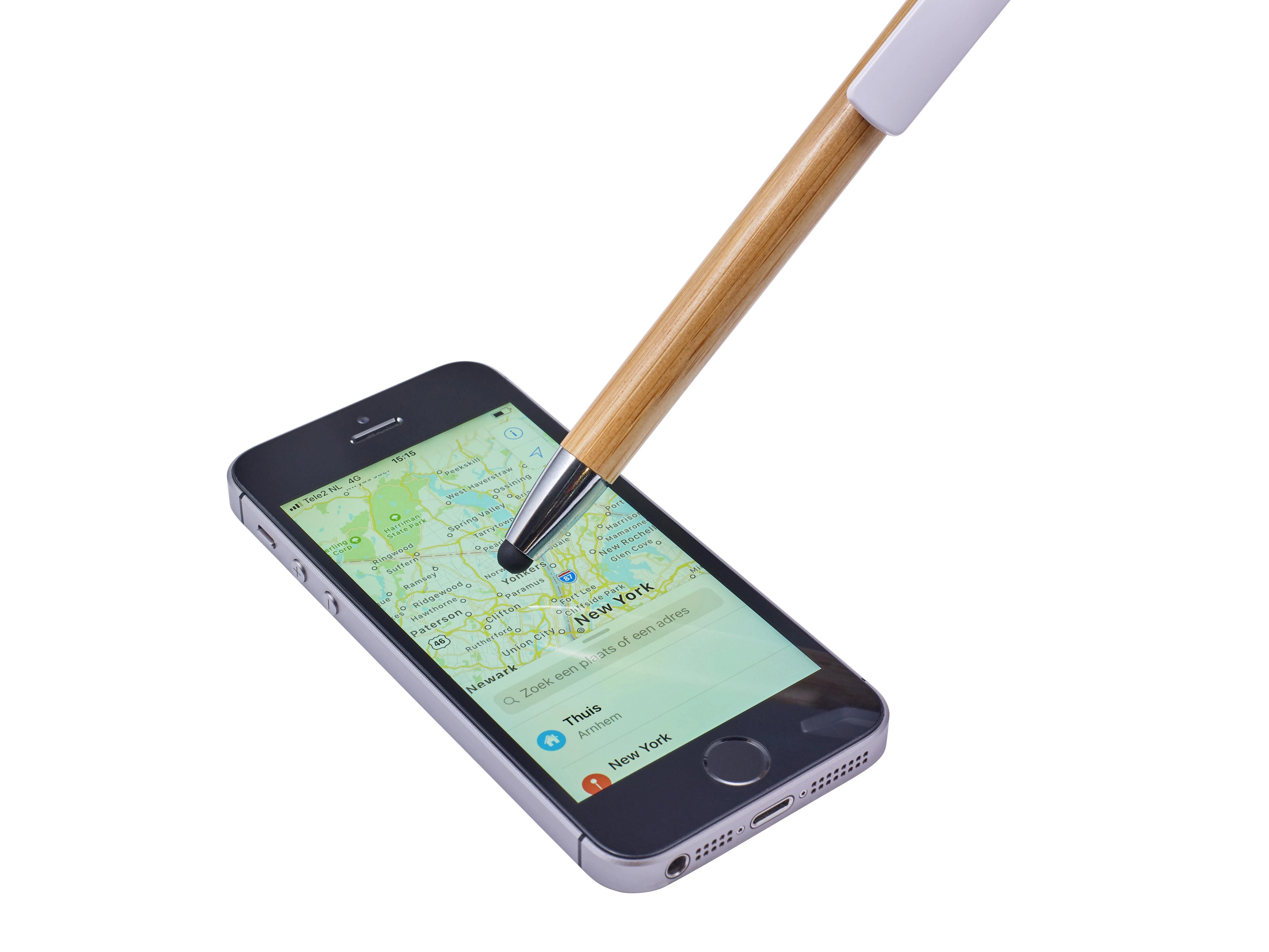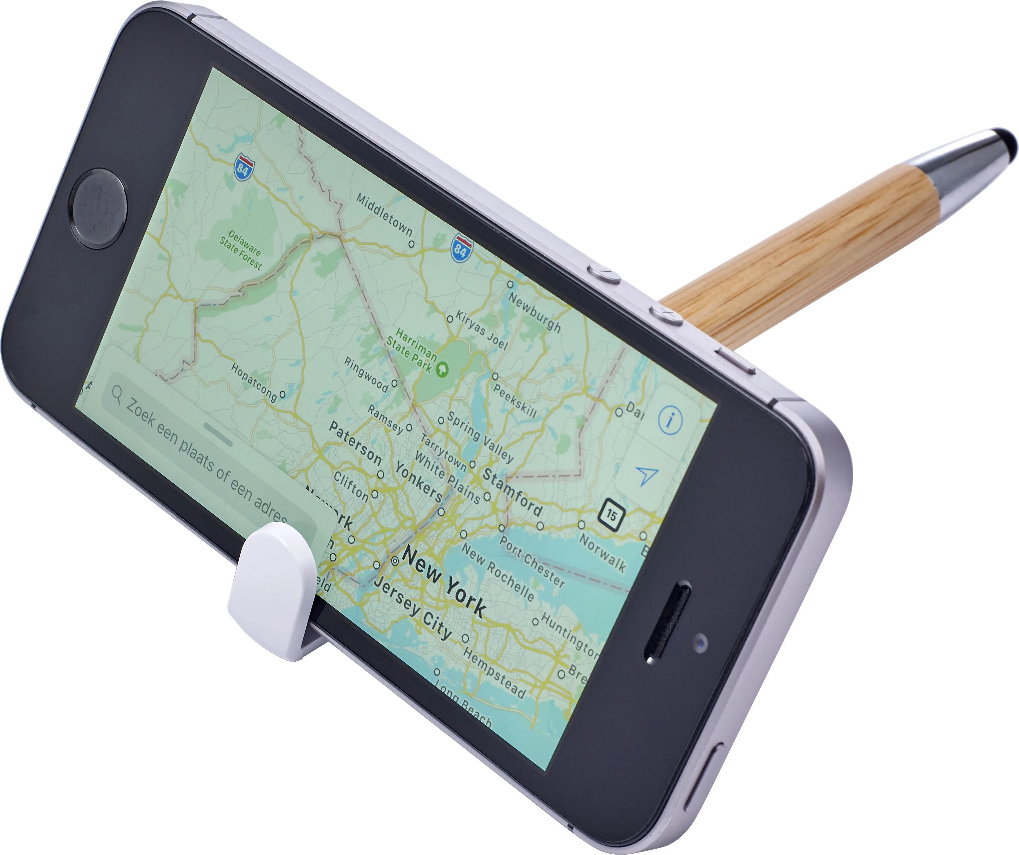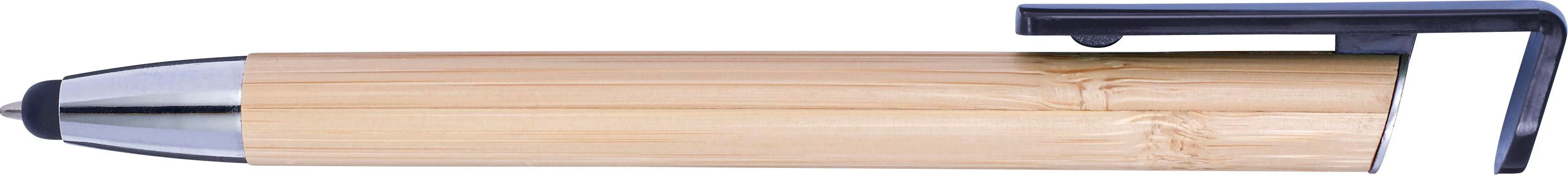 €0.20Kemijska olovka od bambusa s gumiranim vrhom za kapacitivne ekrane i plastičnim vrhom i klipom. Klip služi i kao postolje za pametni telefon. Plava tinta.