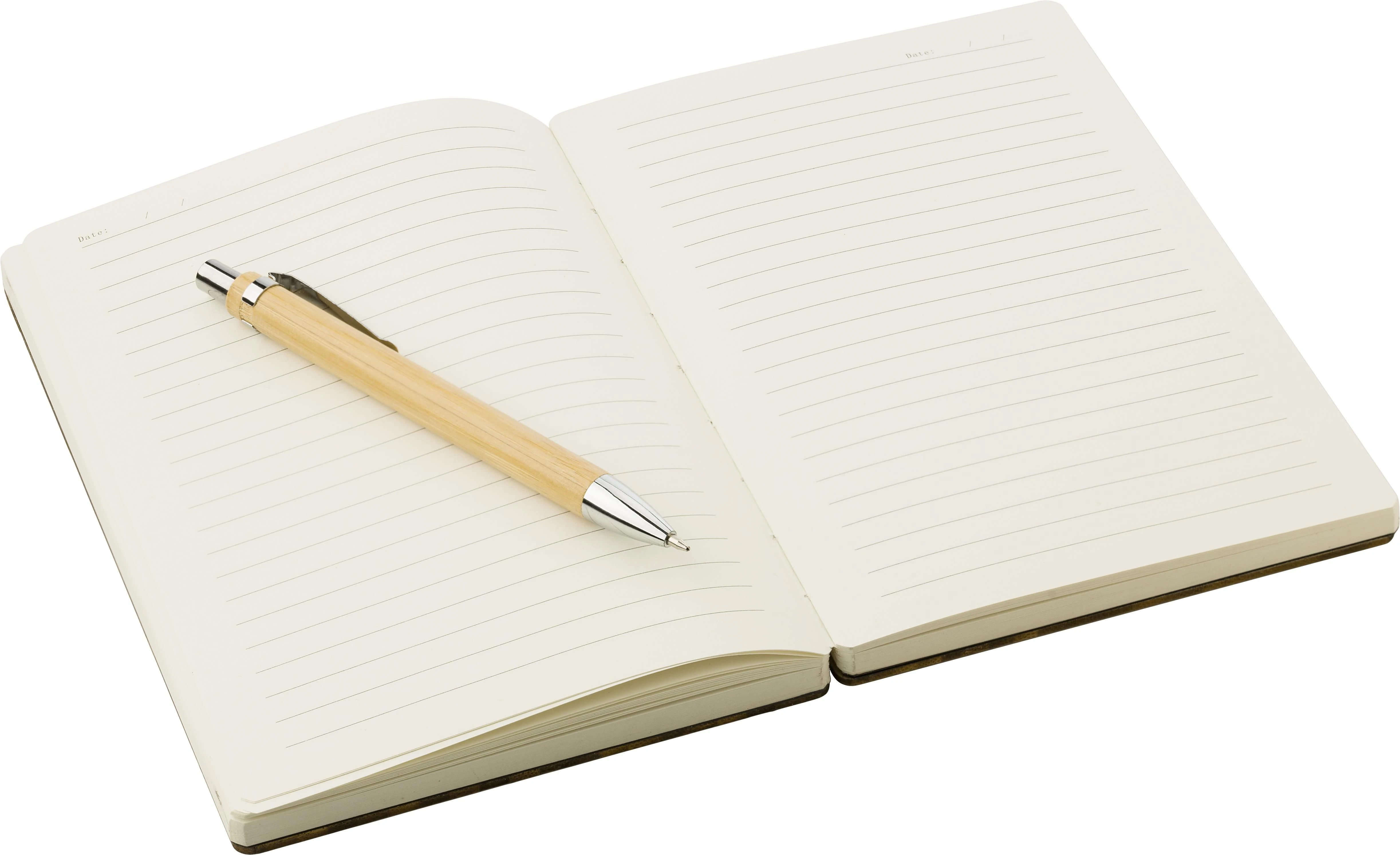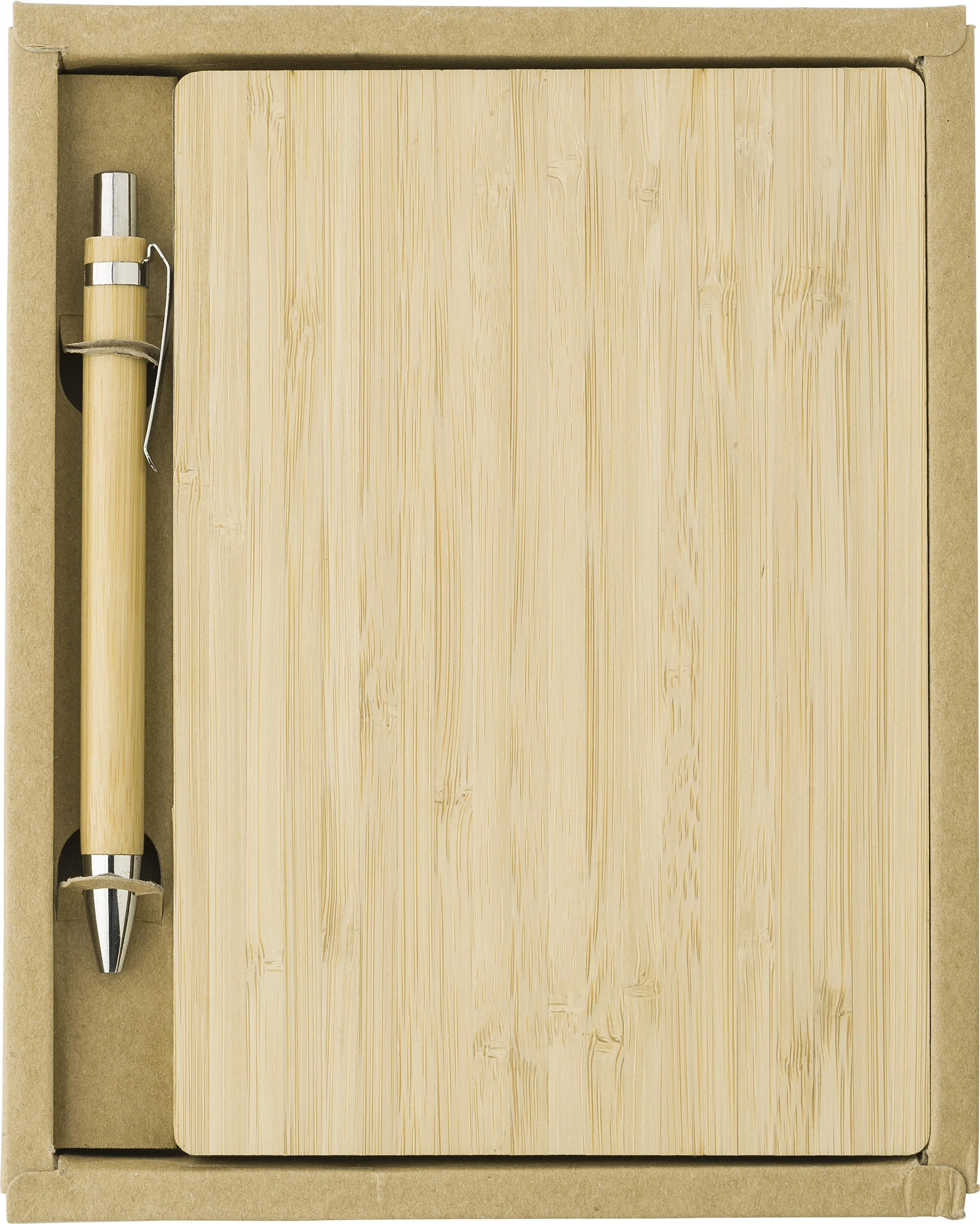 Bilježnica s koricama od bambusa, pakirana u smeđu kutiju od kraft papira, uključuje bambus kemijsku olovku 3804, bilježnica ima 128 liniranih listova s oznakom za datum