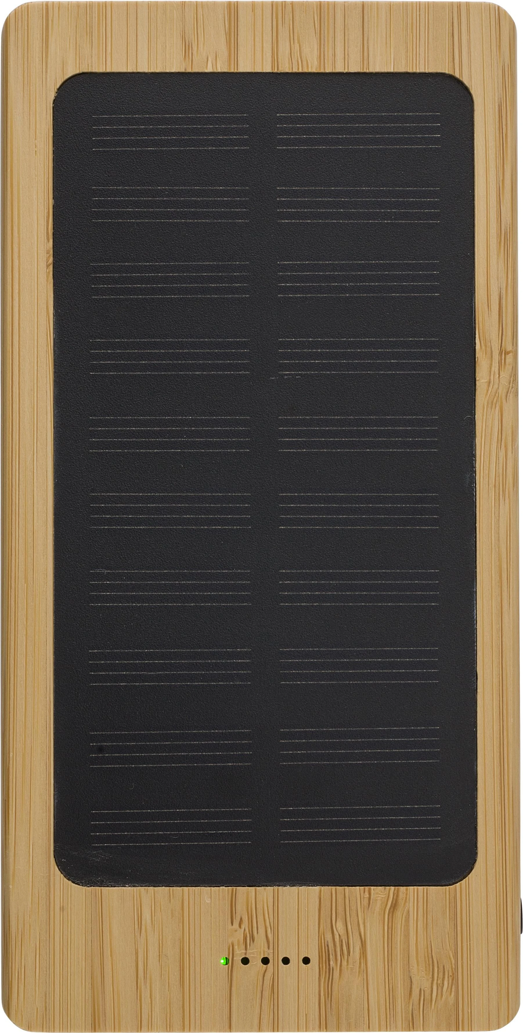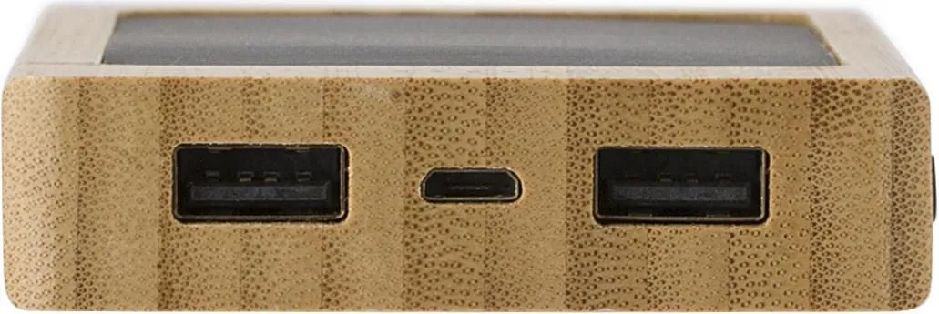 Solarni power bank od bambusa kapaciteta 8.000 mAh, s dva USB priključka i jednim micro USB priključkom te četiri LED indikatora. Ulaz: DC 5V/2A, izlaz: DC 5V/2A. Uključuje kabel.