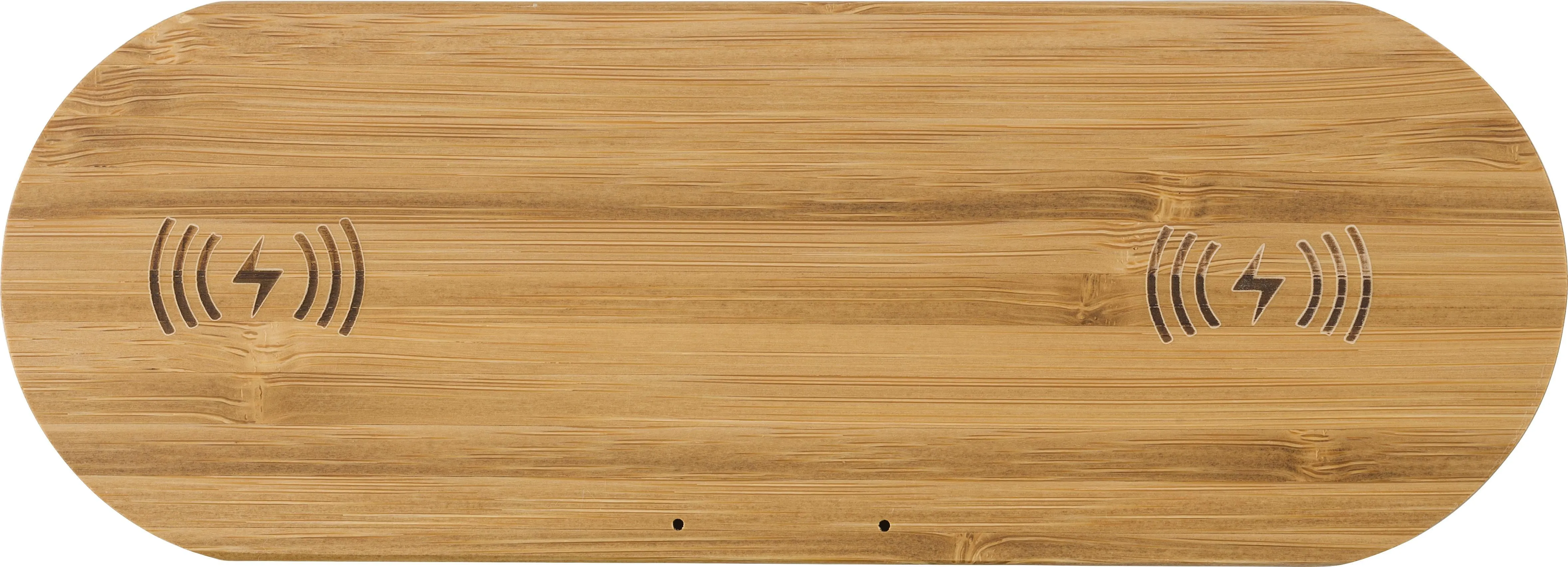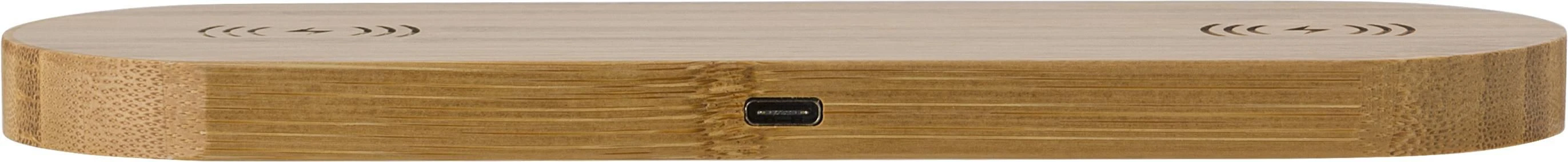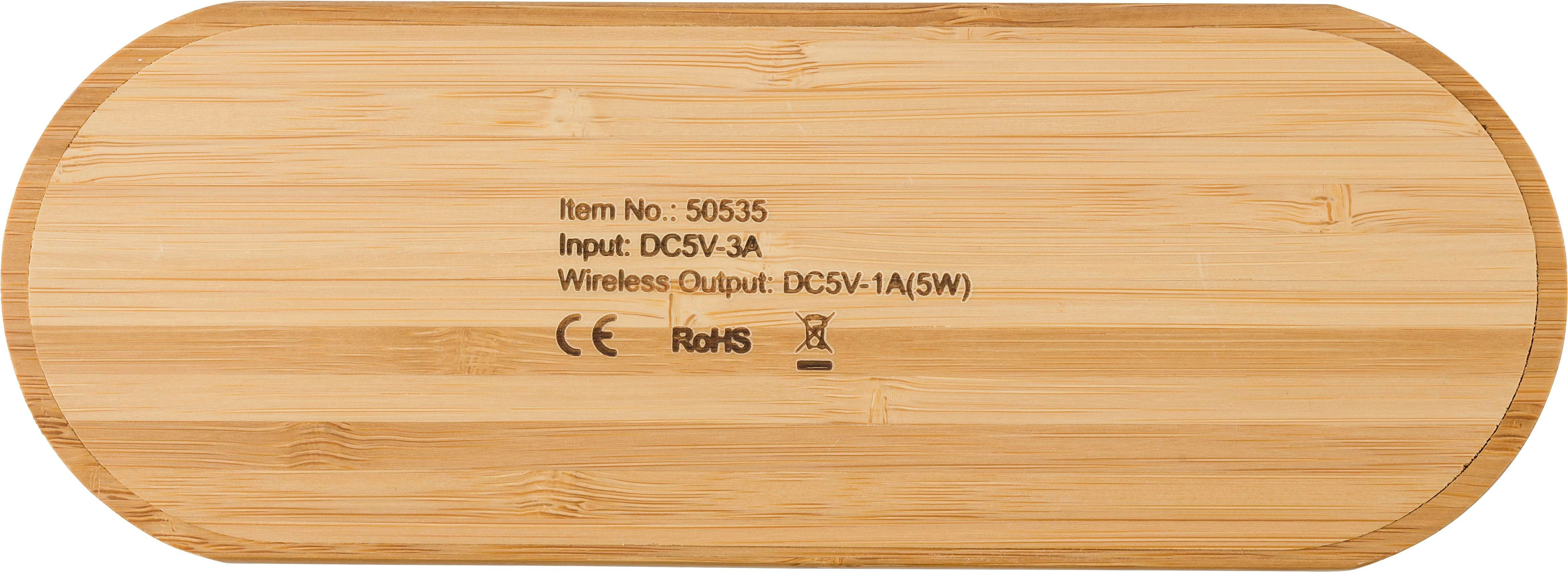 Bežični punjač od bambusa s dvostrukim punjačima. Ulaz: DC5V-3A, izlaz: 2x DC 5V/1A. Uključuje kabel.