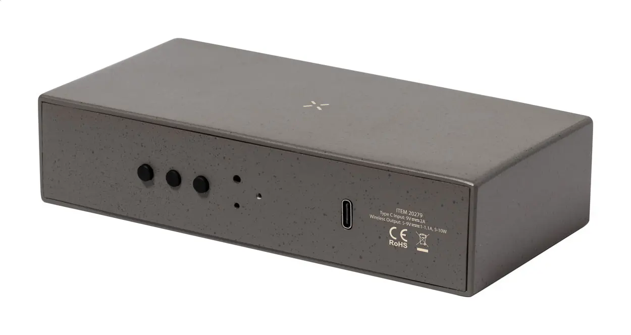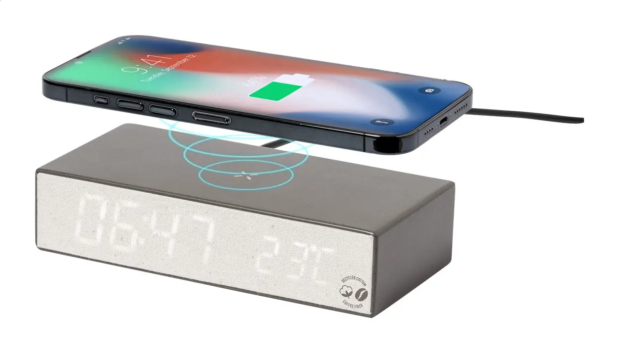 €52.57Multifunkcionalni budilnik od plastike s kavenskim vlaknima i kućištem od recikliranog pamuka, s podesivom svjetlinom, termometrom, kalendarom i ugrađenim bežičnim punjačem (10W).