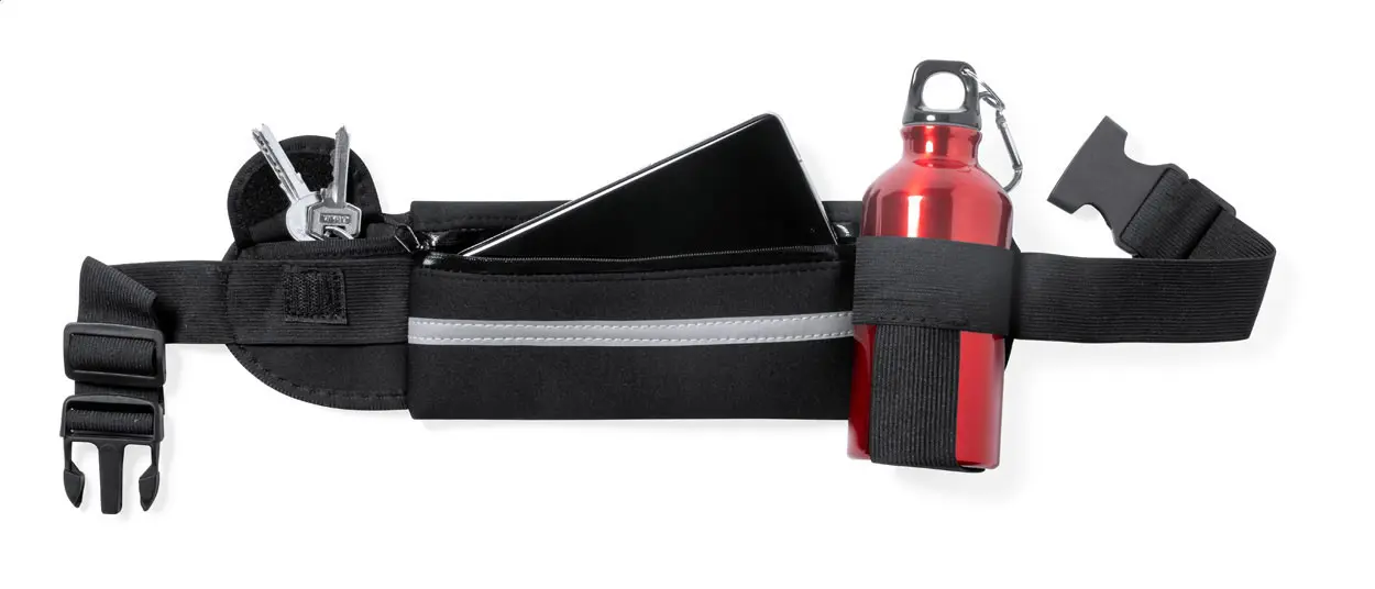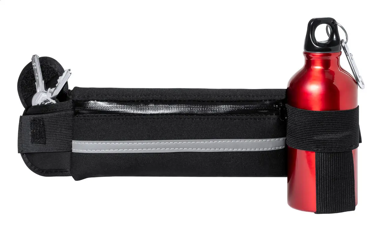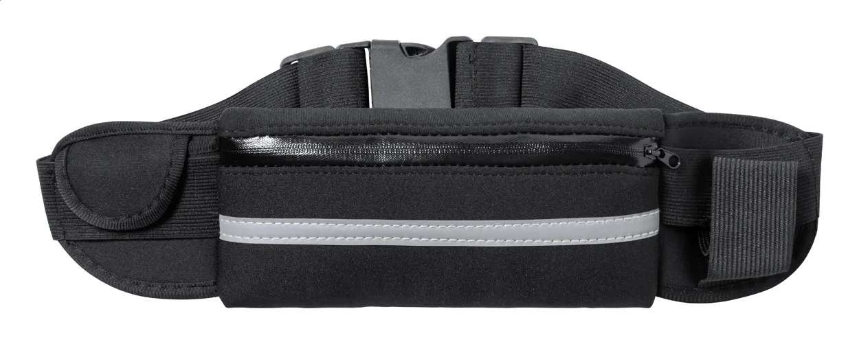 €6.48Torba za nošenje oko struka od softshell materijala s jednim pretincem na patentni zatvarač, malim džepom i elastičnim držačem za bocu, reflektirajućom trakom i podesivim remenom