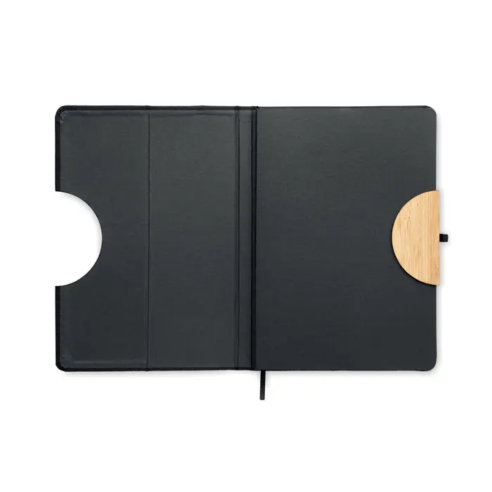 €2.62A5 bilježnica s tvrdim koricama od 600D RPET-a s bambus detaljem i funkcijom stalka za pametni telefon, uvezana, 160 crtane stranice (80 listova) od recikliranog papira 70 g/m², elastična traka za zatvaranje, oznaka stranice i držač za olovku, FSC® certifikat | FSC MIX CREDIT, P7.1, FSC-C213206
