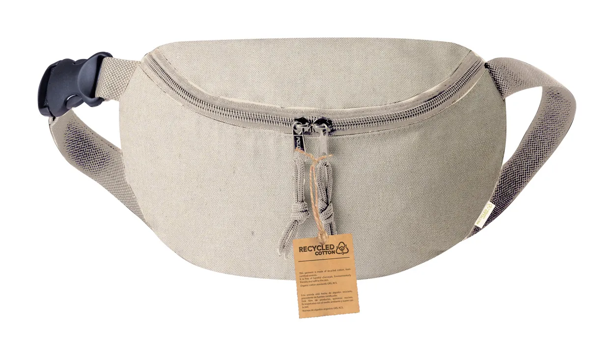 Torba za nošenje oko struka od recikliranog pamuka s pretincem na patentni zatvarač i podesivim remenom, s prepoznatljivom etiketom recikliranog pamuka, 100% reciklirani pamuk, 300 g/m²