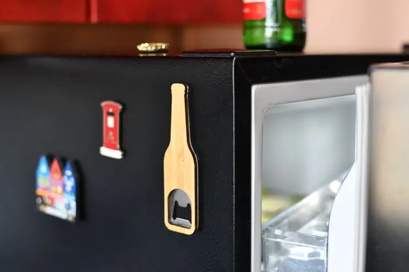 €2.57Otvarač za boce u obliku boce s bambusom s jedne strane i brušenim metalom s druge, s dva ugrađena magneta za pričvršćivanje na hladnjak