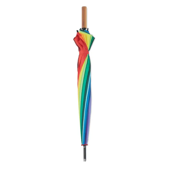 €9.85Kišobran s automatskim otvaranjem u duginim bojama od 190T Pongee materijala, promjera 27 inča, s drvenom drškom, rebrima od stakloplastike, crno obloženim metalnim vrhovima i vrhom. Sastoji se od 16 panela.