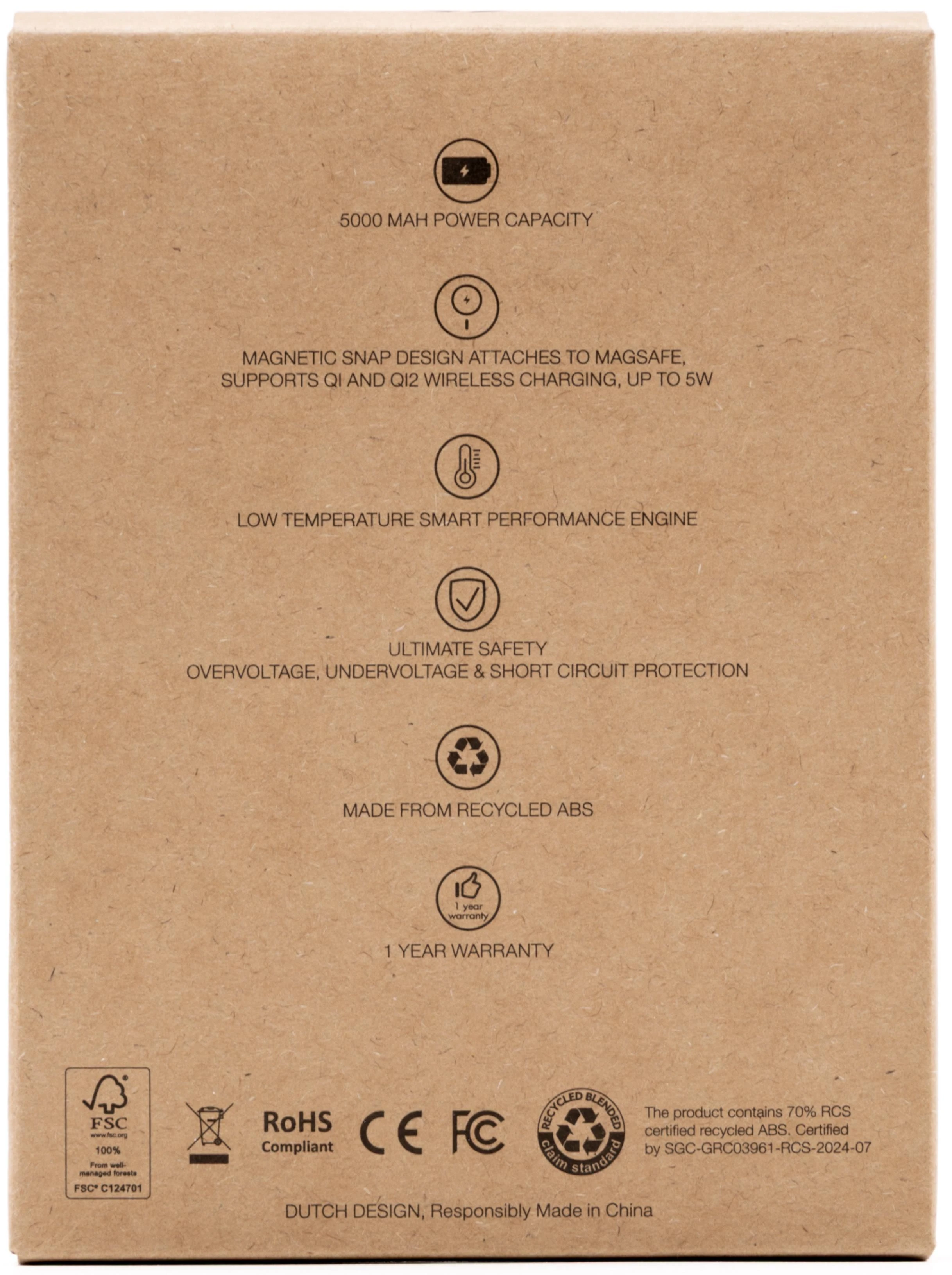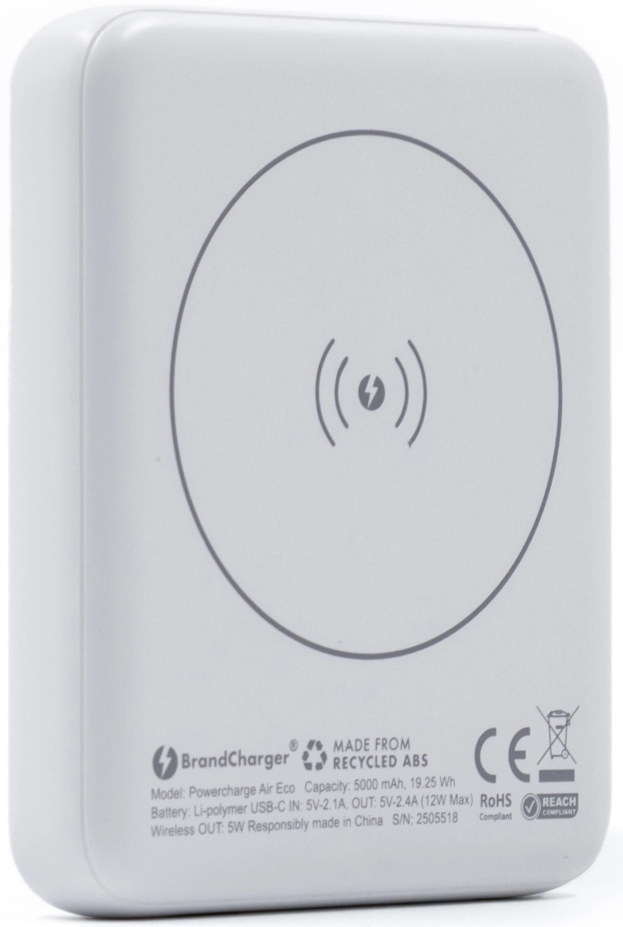 Powercharge Air je ultra tanka magnetska bežična powerbank baterija od recikliranog ABS-a, kapacitet 5000 mAh, podržava 5W magnetsko bežično punjenje kompatibilno s MagSafe, Qi1 i Qi2 standardima, ima 12W USB-C priključak za žično punjenje, uključuje pametni sigurnosni čip za zaštitu od prevelike struje, prekomjernog pražnjenja, prepunjavanja, pregrijavanja i kratkog spoja, opremljena LED indikatorom i pametnim upravljačkim sustavom, USB-C ulaz: 5V, bežični izlaz: 5W