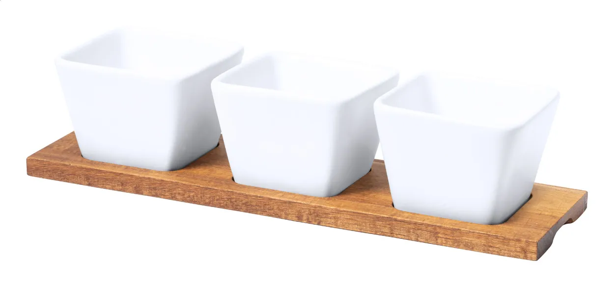 3 pc ceramic serving bowl set with wooden holder.