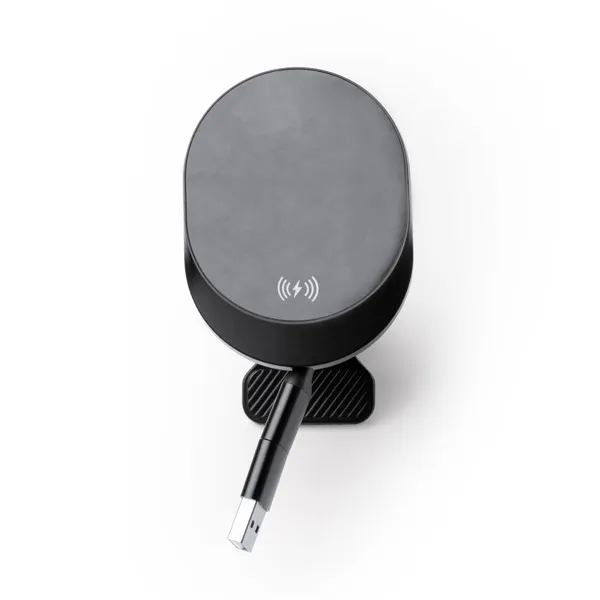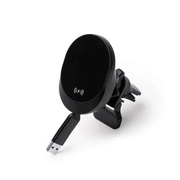 €12.50In car wireless charger for smartphone with output power up to 15 W. Features a built-in retractable Type C cable with a USB adapter. Includes a magnetic ring for the device and an air vent mounting accessory. Presentation in design box.