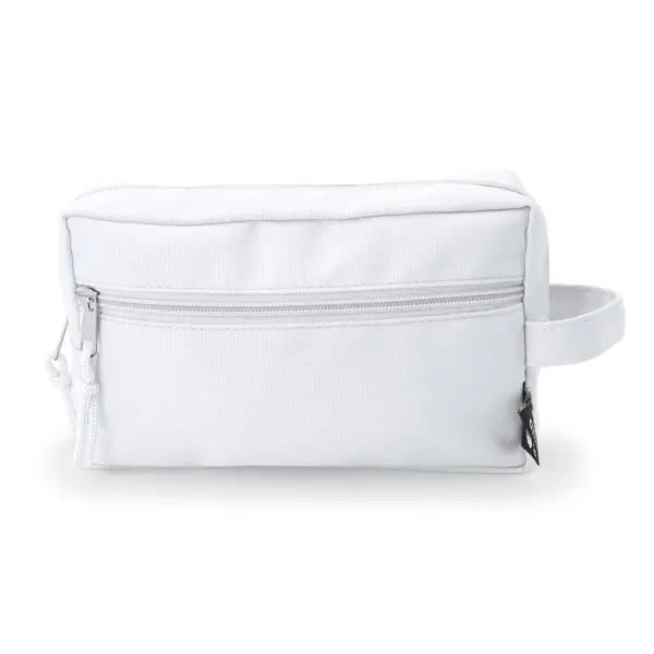 €2.13Toaletna torba s dvije pregrade na patentni zatvarač i odgovarajućom vezicom za nošenje. Vezica na zatvaraču i vanjska etiketa s RPET logotipom.