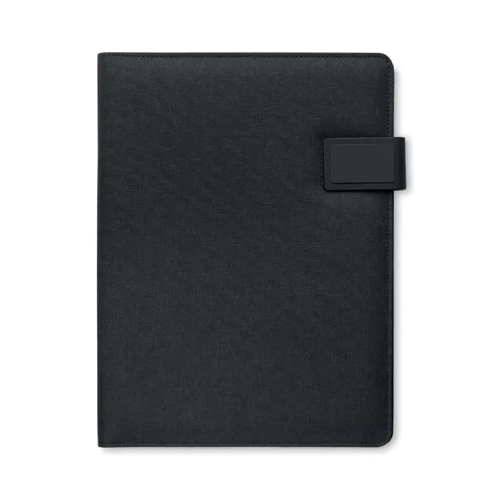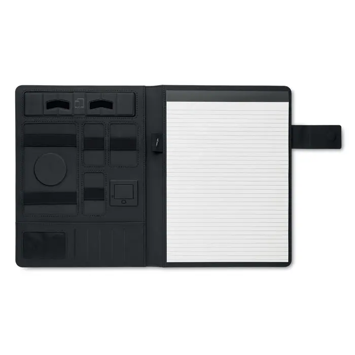 A4 konferencijska mapa s koricama od lanenog PU-a powerbank 5000 mAh i magnetski bežični punjač 15W blok od 20 liniranih listova više unutarnjih pretinaca magnetsko zatvaranje elastični držač za olovku