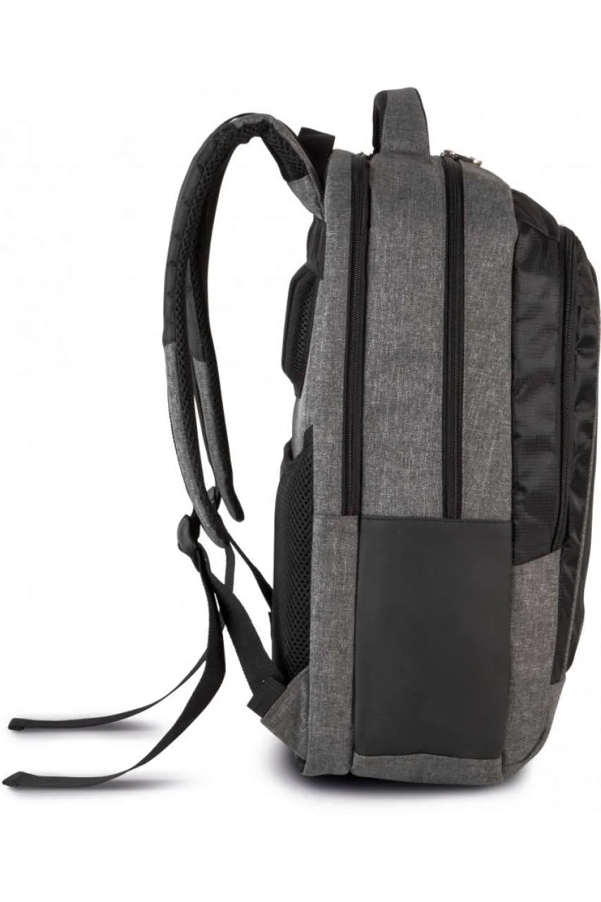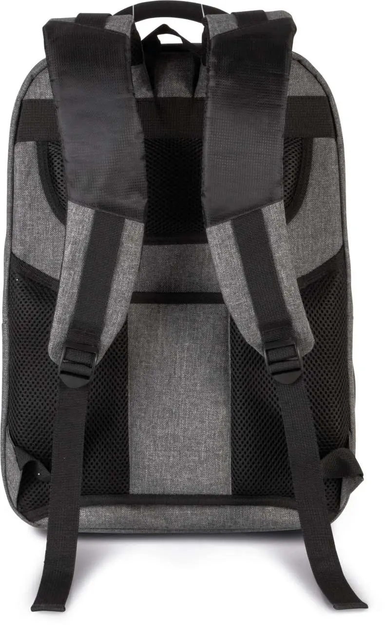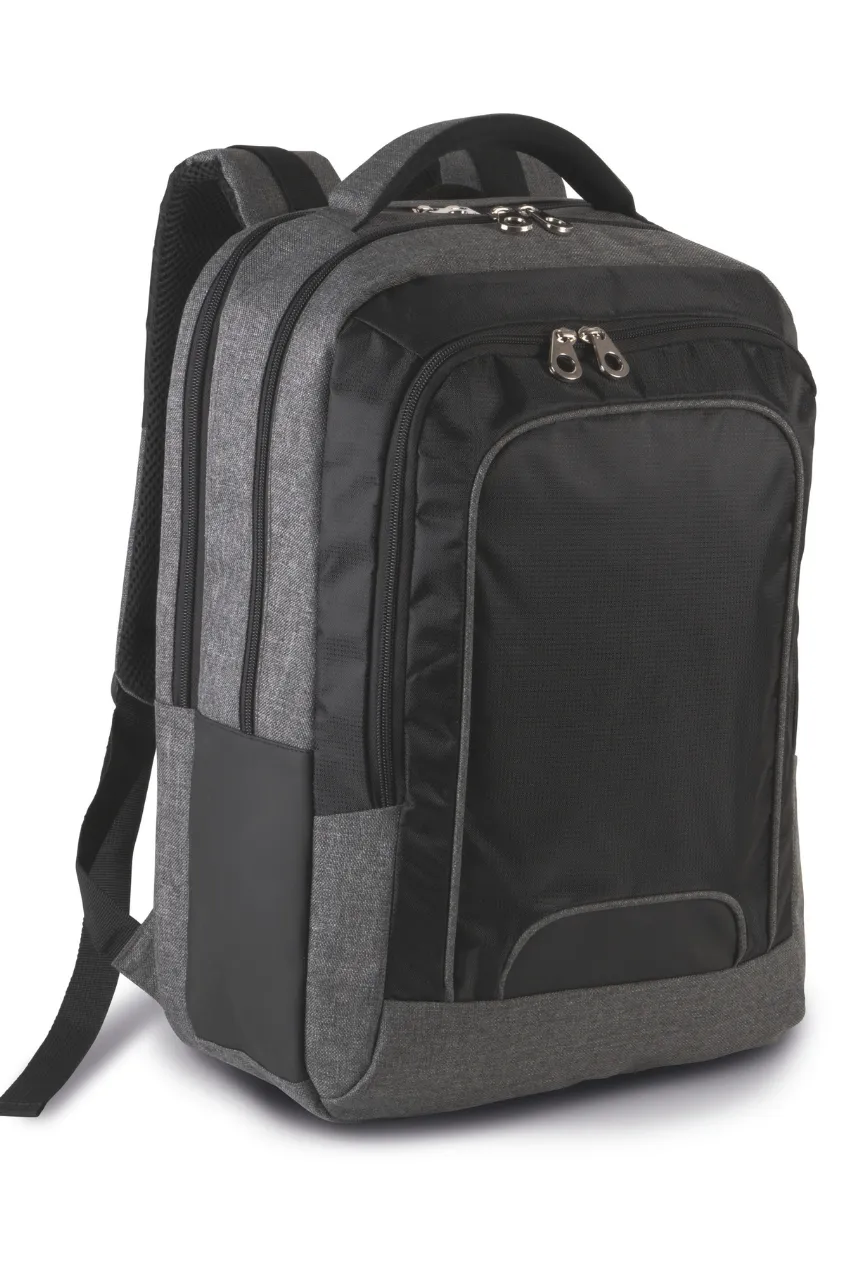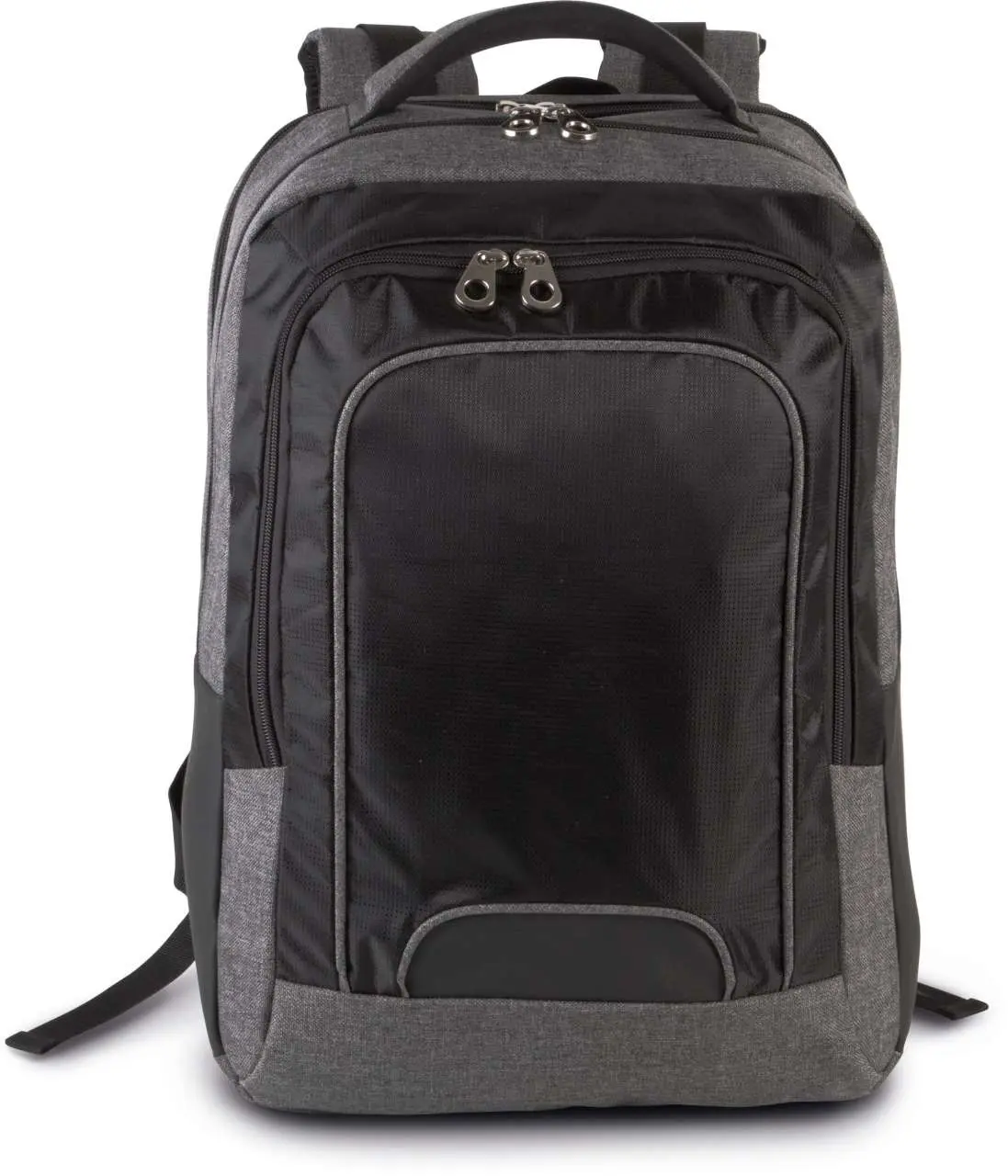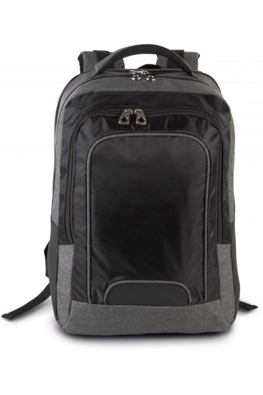 Ruksak od 600D poliestera s kontrastnim umetkom od poliesterskog dobbyja, tri pretinca s patentnim zatvaračem i podstavljenim pretincem za laptop do 15 inča, podstavljena gornja ručka, leđa i ergonomske naramenice, stražnja strana s navlakom za pričvršćivanje na ručku kofera