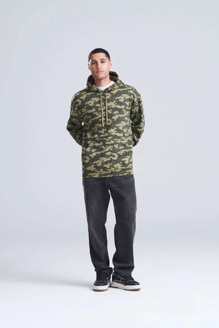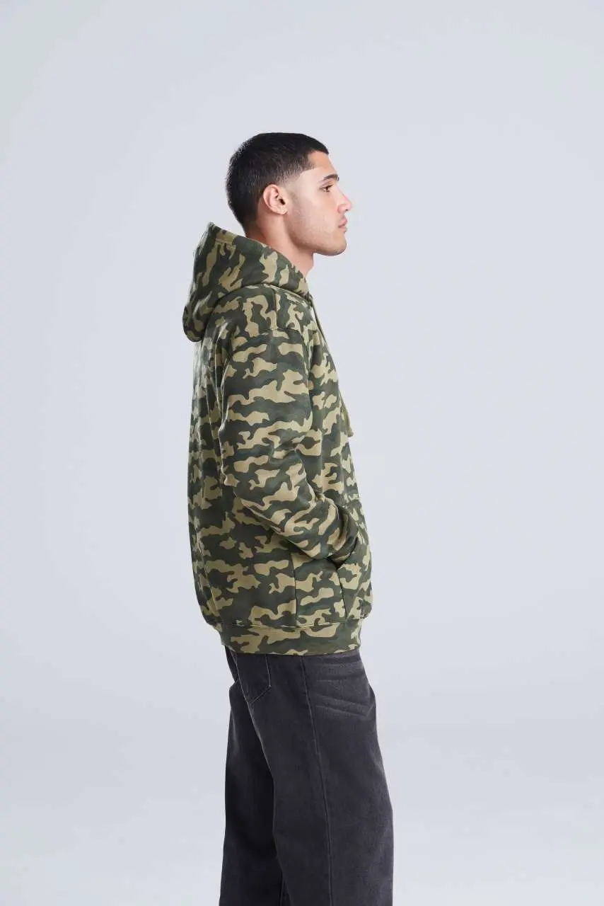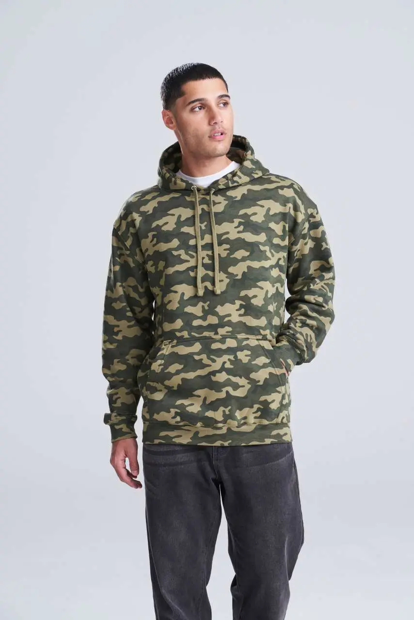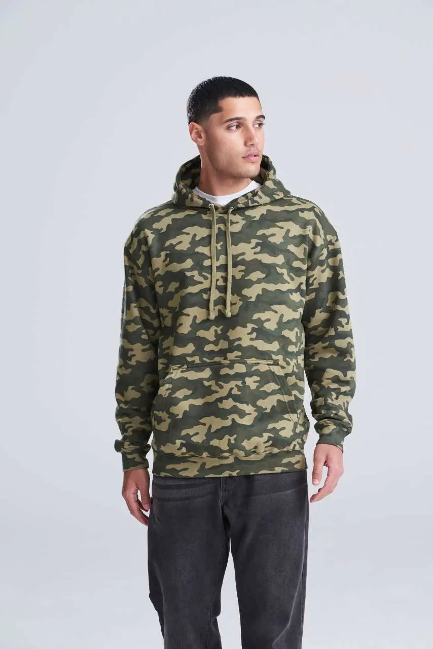 €2.1470% ringspun pamuk, 30% poliester, opušteni kroj, klasičan maskirni uzorak, dupla tkanina na hoodieu, klokanski džep, ravne vezice, brušena unutarnja flis tkanina, rebraste manšete i porub, dvostruki šavovi, odvojiva etiketa, površina od 100% pamuka