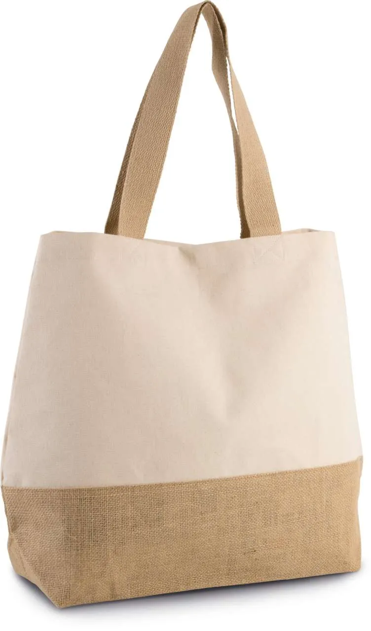 Velika pamučna torba s kontrastnom laminiranom podlogom od prirodne jute, unutarnji džep s patentnim zatvaračem, prošireni donji dio, pamučne ručke duljine 55 cm, magnetsko kopčanje na pritisak
