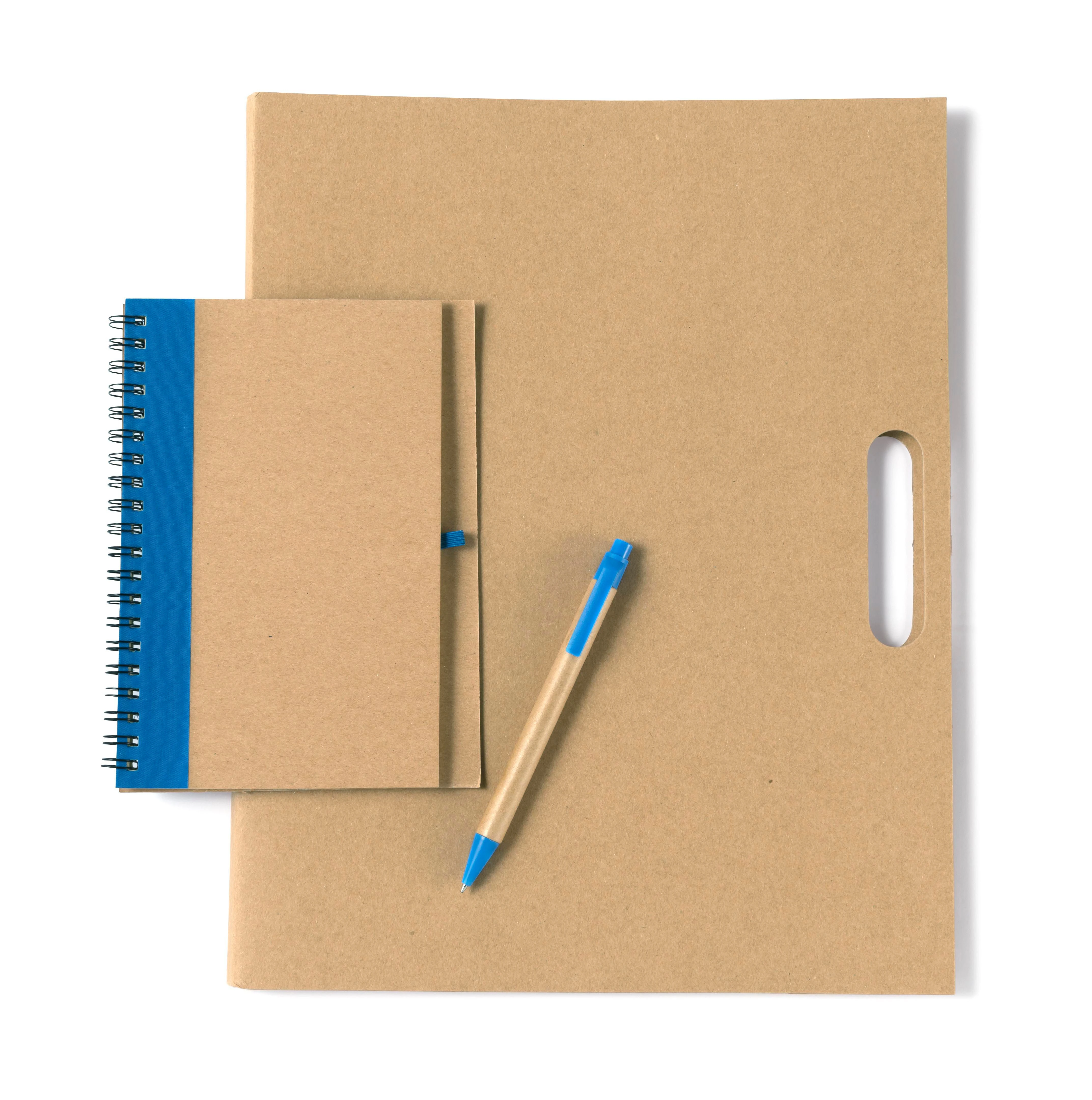 Mapa od kartona s notesom od 25 liniranih listova, više boja samoljepljivih papirića (25 listova po boji) i držačem za olovku s kartonskom kemijskom olovkom plave tinte