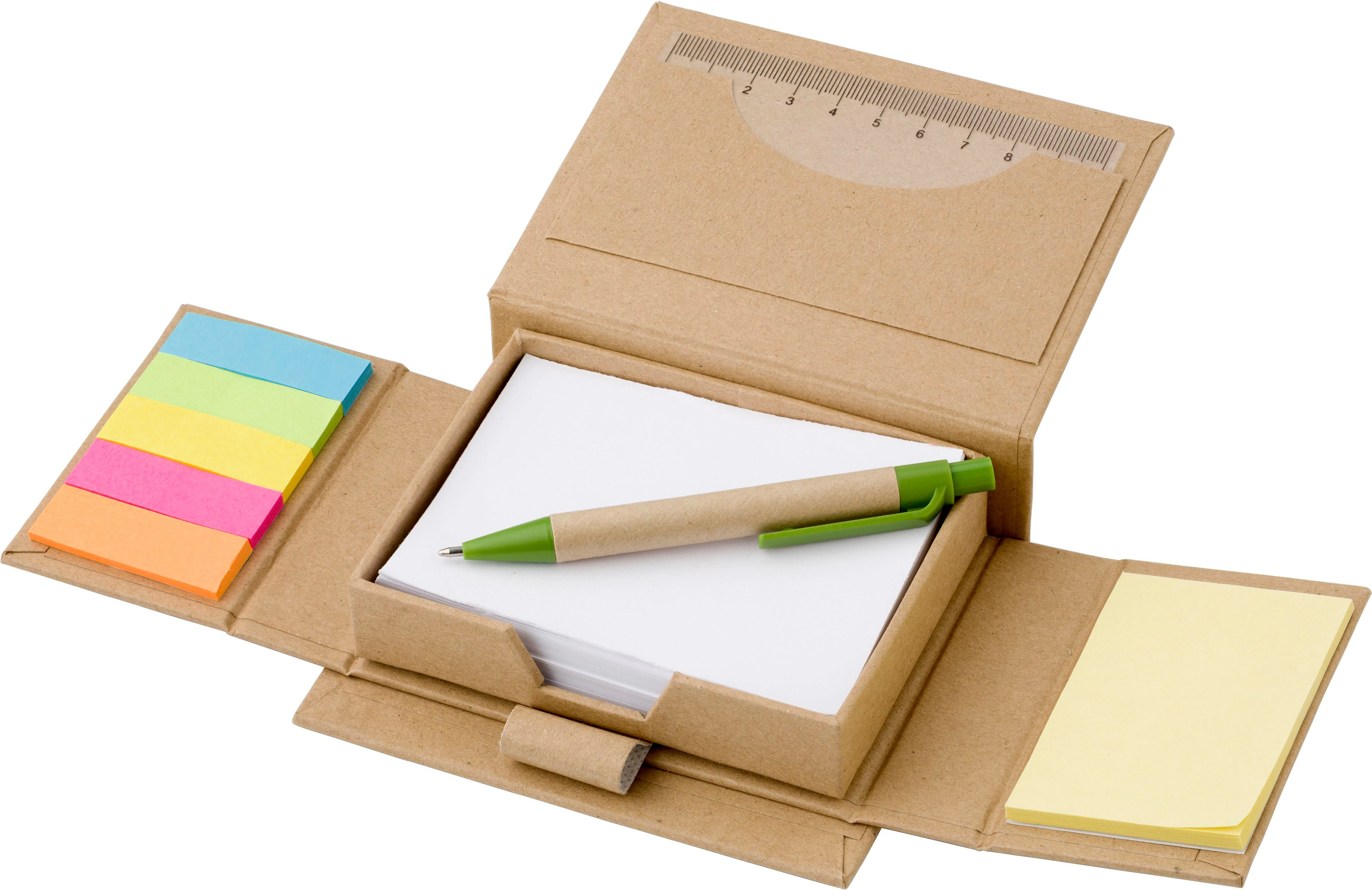 €1.86Držač za bilješke od kartona s plastičnim ravnalom u poklopcu, 150 samoljepljivih papirića, blokom od 160 praznih listova i držačem za olovku s kemijskom olovkom plave tinte