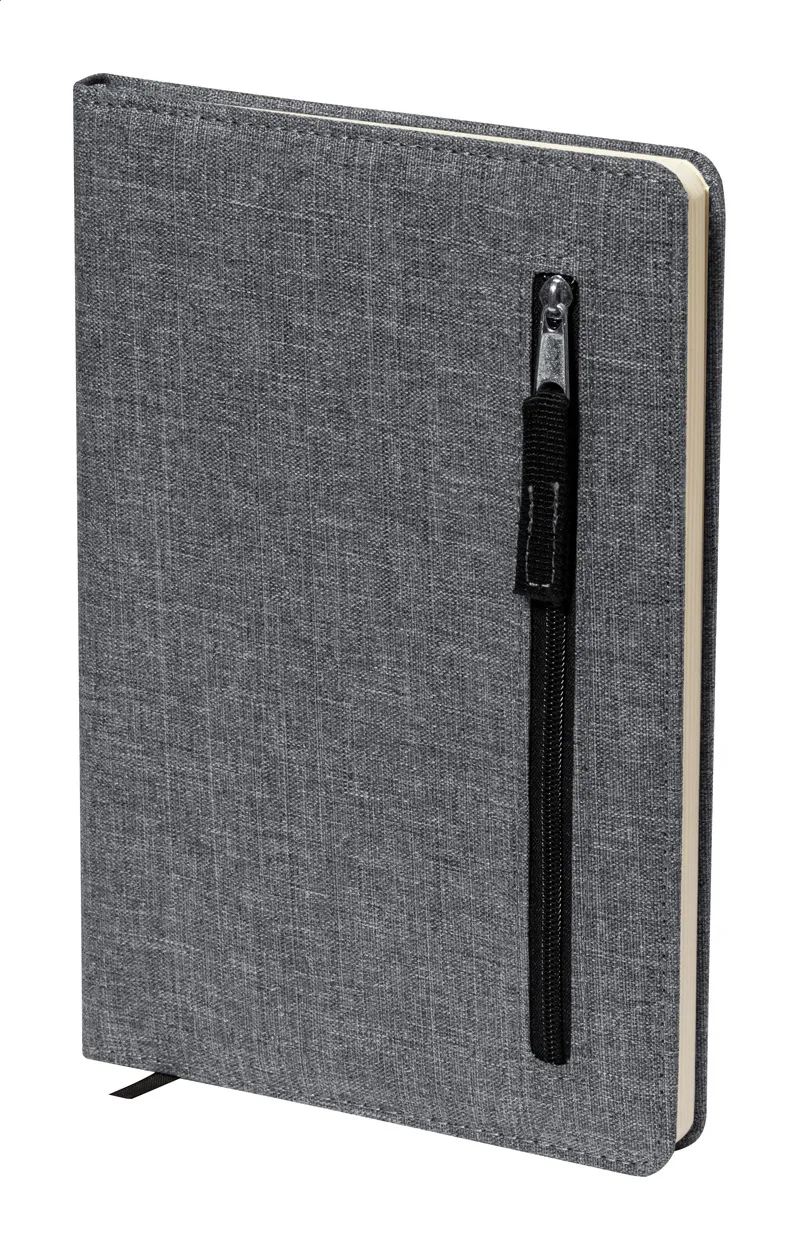 Bilježnica s koricama od 300D RPET poliestera s prednjim džepom na patentni zatvarač, oznakom za stranicu i 100 liniranih listova, A5 format