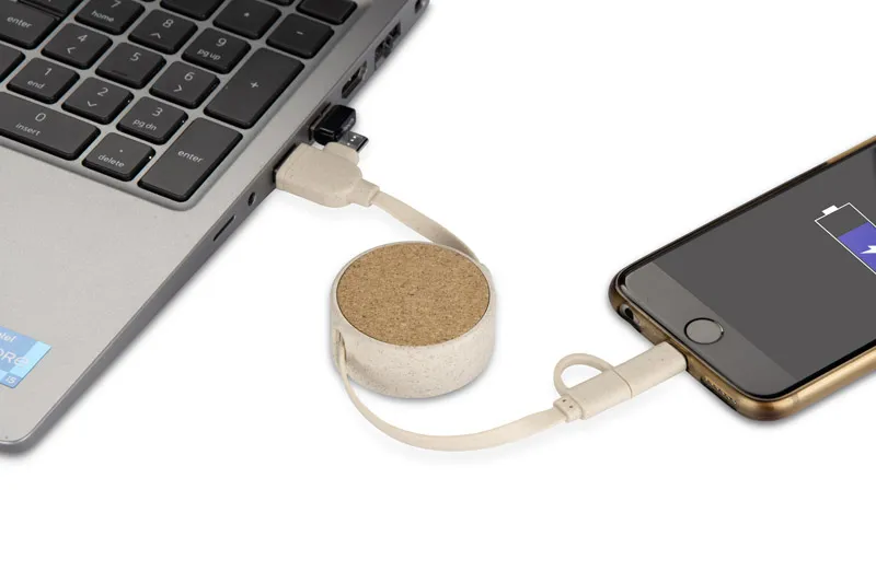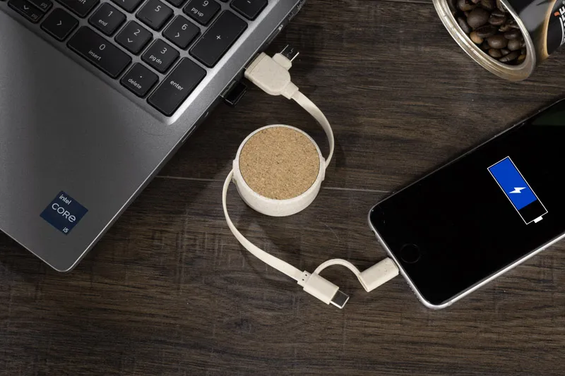 €9.82Punjački kabel SLOPI od pluta i plastike od pšenične slame, s USB, 2 x USB C i Lightning priključcima, spiralni dizajn za jednostavno spremanje