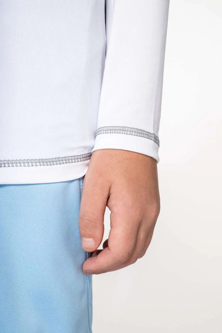 88% poliester/12% elastan Izrađeno od 88% recikliranog poliestera i 12% elastana Rastezljiva mreža Uski kroj UV50+ zaštita u skladu sa standardom EN13758-1&2 Dugi raglan rukavi s kontrastnim prošivanjem Visoki ovratnik Elastična kopča unutar prednjeg ruba za umetanje vezice kratkih hlača i držanje majice Dvostruki šav na rukavima i donjem rubu Odvojiva markirna etiketa za lakše preimenovanje
