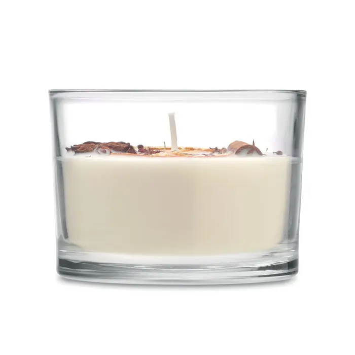 €7.99Svijeća od biljnog voska s mirisom cimeta i citrusa s osušenim cvijećem i voćem u staklenoj posudi 300 g vrijeme gorenja: 50 sati