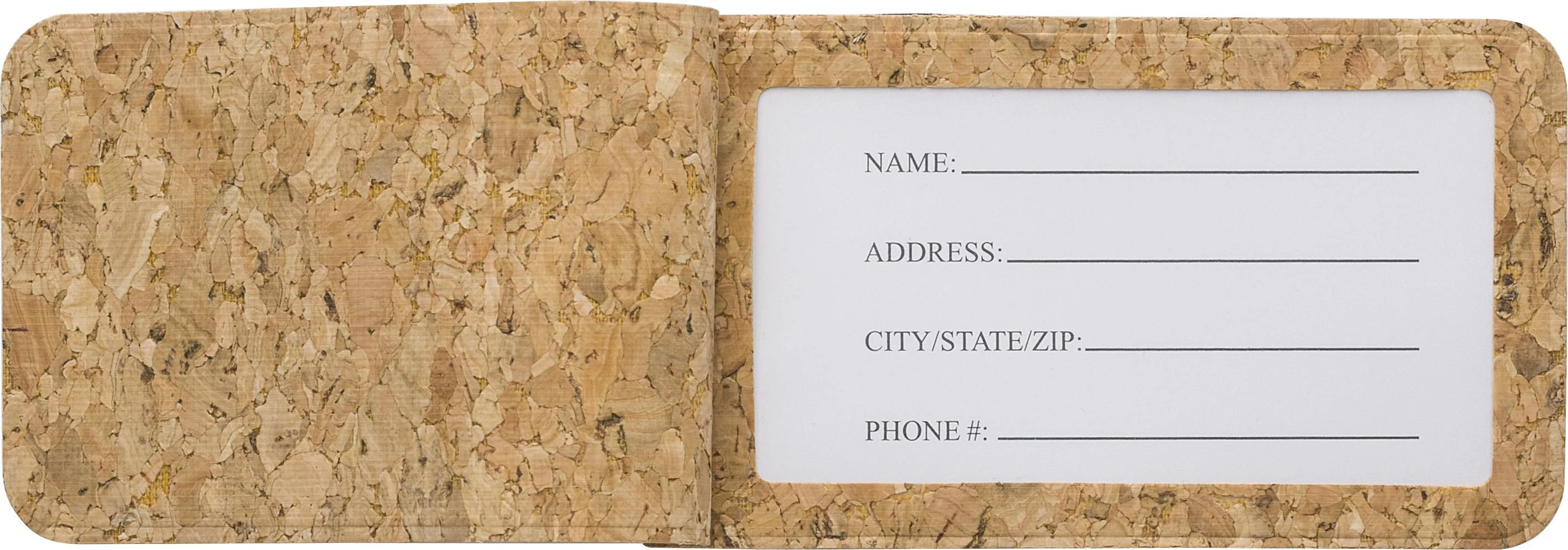 Oznaka za prtljagu od pluta s elastičnom trakom, umetkom za osobne podatke (ime, adresa, grad/država i broj telefona), pojedinačno pakirana u polietilenskoj vrećici