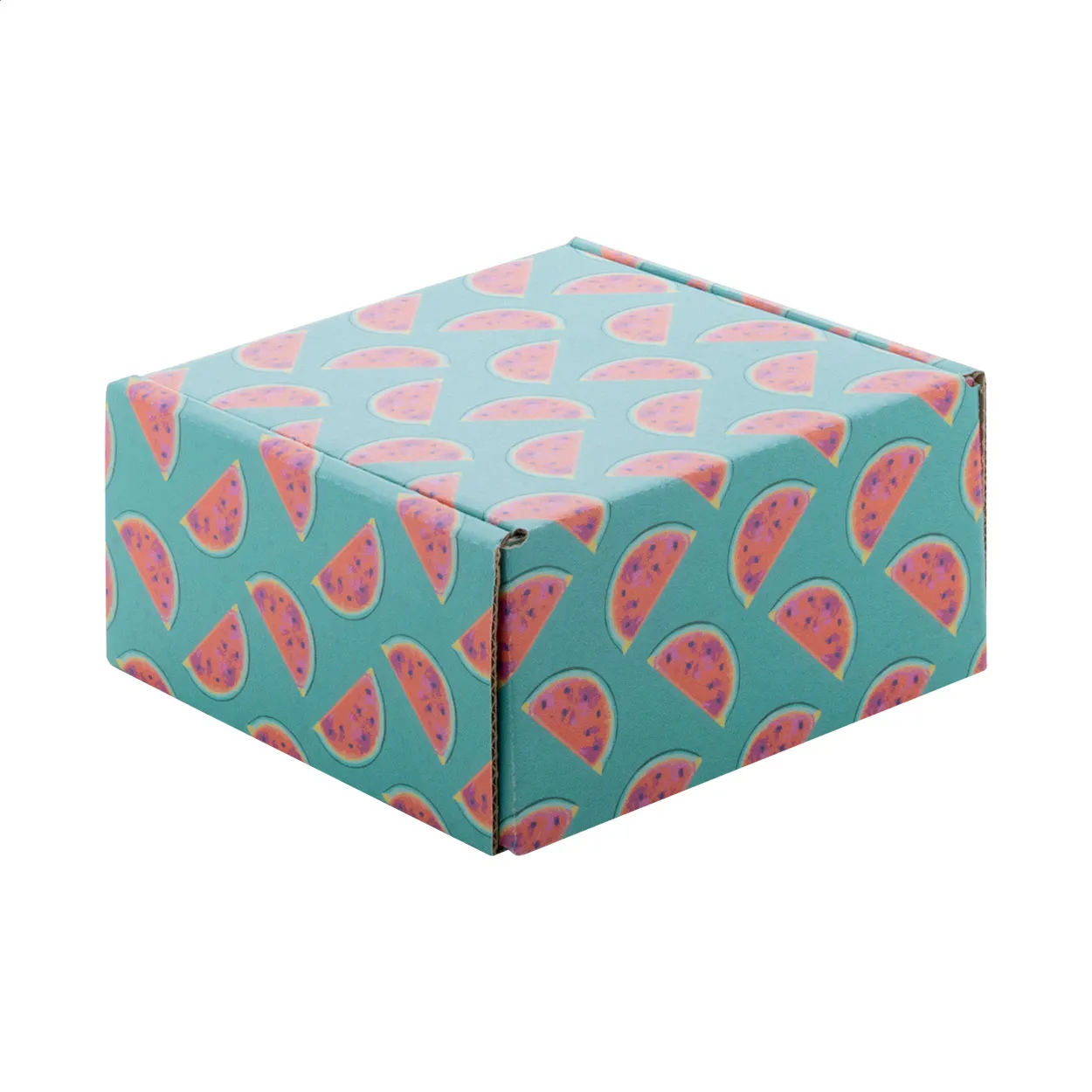 Custom made, full colour printed corrugated cardboard, square based postal gift box with self-sealing strip. Delivered flat-packed. MOQ: 50 pcs.