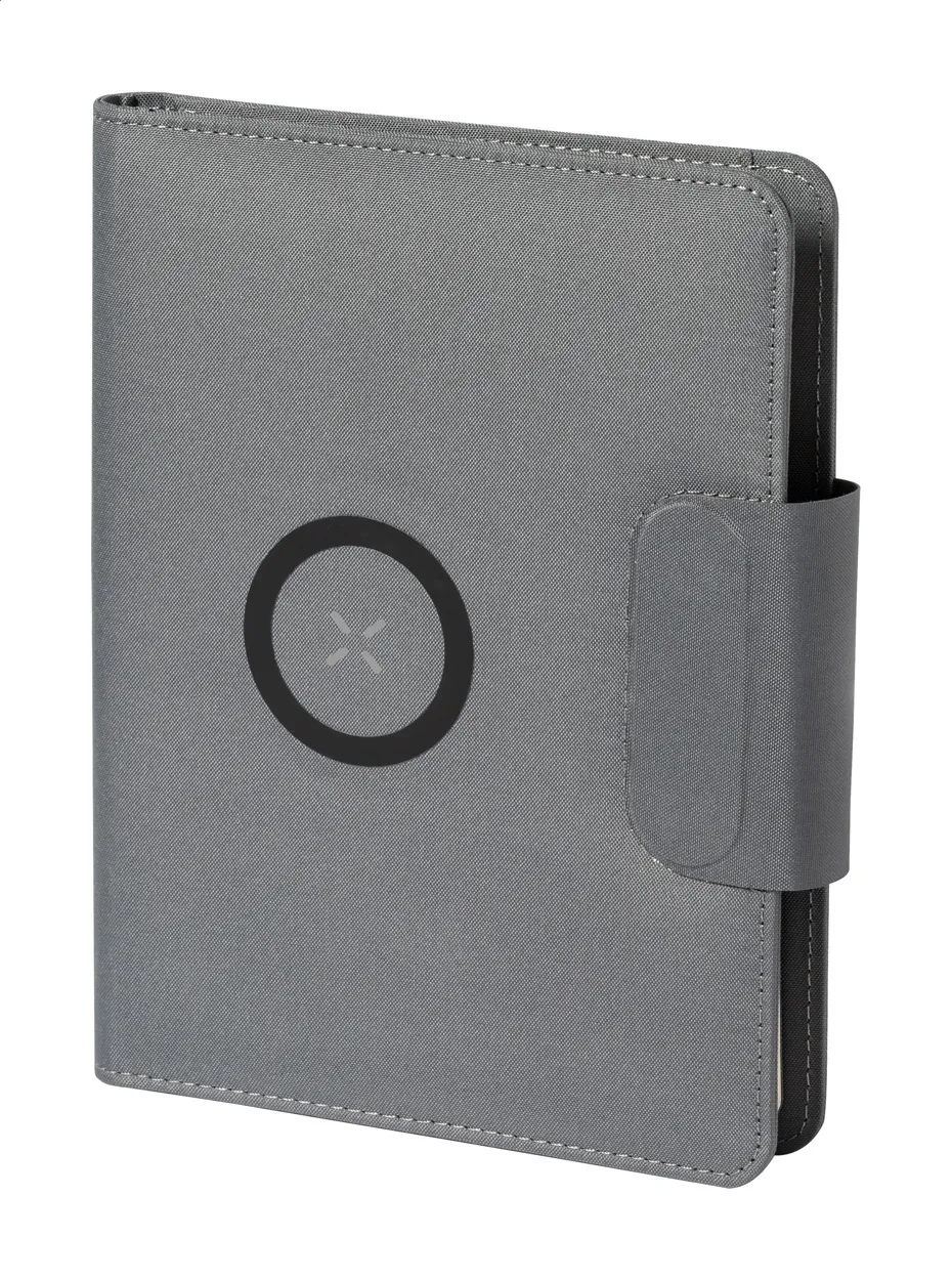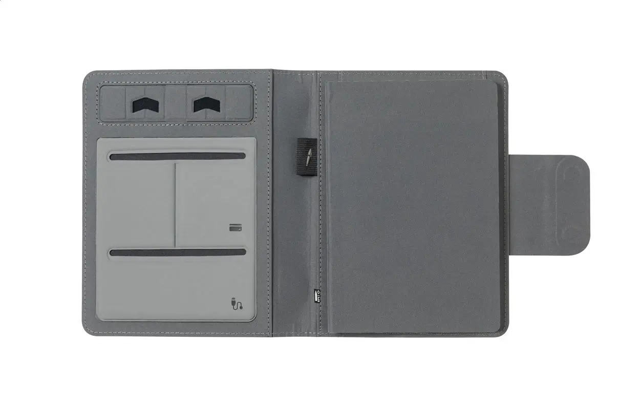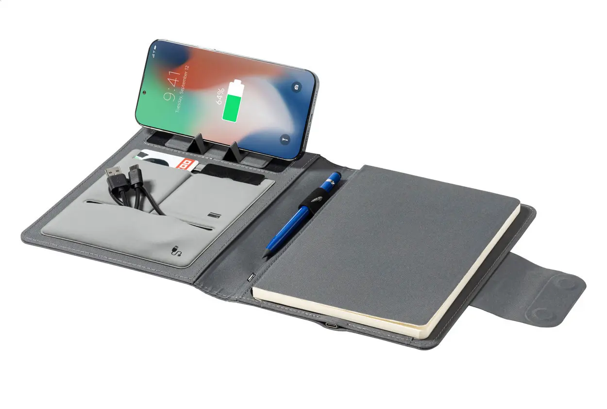 €136.62Mapa za dokumente A5 formata od 300D RPET poliestera s blokom od 65 liniranih listova, ugrađenim magnetskim bežičnim brzim punjačem (10W), powerbankom od 5000 mAh s USB priključkom za punjenje i preklopnim držačem za mobitel, uključuje samoljepljivi metalni prsten za magnetsku funkciju na svakom uređaju s bežičnim punjenjem i USB kabel za punjenje