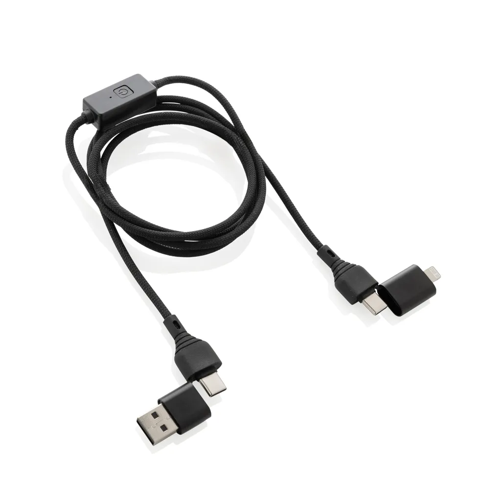 €8.2560W kabel za punjenje i prijenos podataka koji može brzo puniti sve vaše mobilne uređaje, a podržava i punjenje prijenosnika. Kabel ima jedinstveni integrirani gumb za isključivanje funkcije prijenosa podataka kada ga koristite na javnim mjestima kako biste izbjegli krađu podataka ili pristup hakera vašem telefonu. Jednostavno pritisnite gumb za aktiviranje zaštitnog načina. Kabel je izrađen od recikliranog TPE, PET, ABS i recikliranog aluminija. Dugačak je 120 cm i podržava Car play i Android auto (samo tip C do tipa C). Ukupni reciklirani sadržaj: 52% na temelju ukupne težine predmeta. RCS certifikacija osigurava potpuno certificiran lanac opskrbe recikliranim materijalima. Pakirano u FSC mix ambalažu. Bez PVC-a.