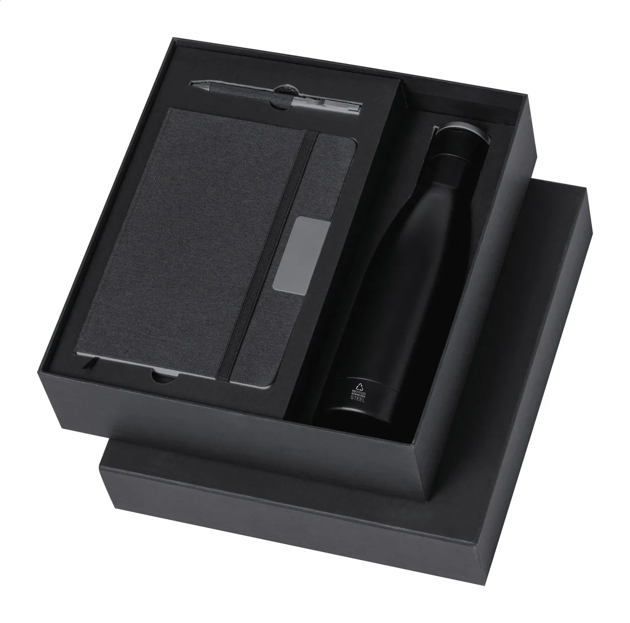 Trodijelni uredski set u crnoj gift box kutiji uključuje dvostruku vakuum bocu od recikliranog nehrđajućeg čelika (500 ml), RPET bilježnicu s gumicom, oznakom i 80 liniranih listova, RPET kemijsku olovku na okretanje s plavim punjenjem