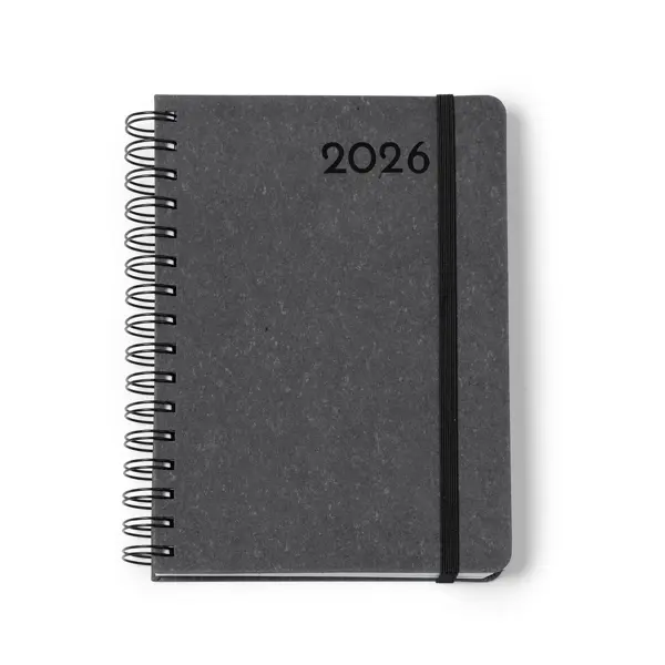 A5 dnevnik sa spiralnim uvezom, korice od reciklirane kože s niskim reljefnim graviranjem i elastičnom trakom, 348 listova plus 4 stranice s kartama, bijeli listovi, isporuka u kraft kutiji
