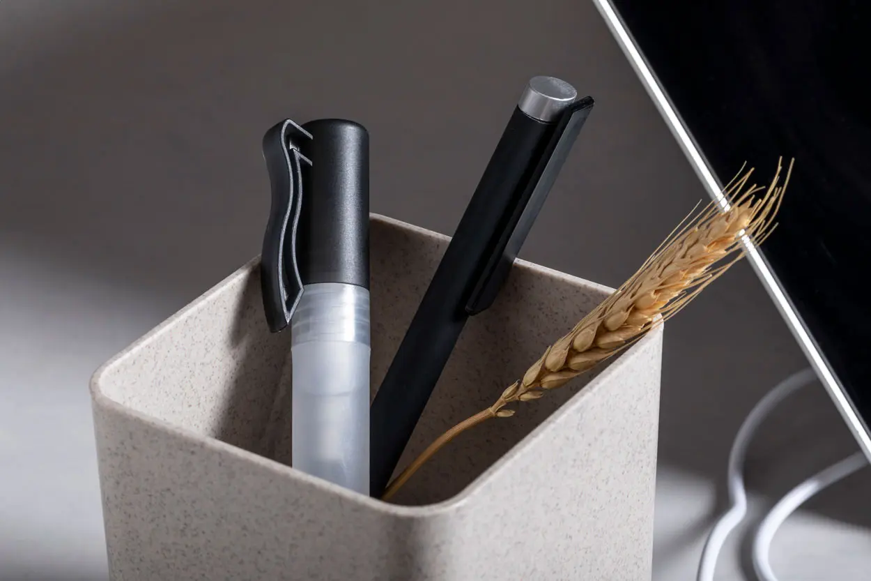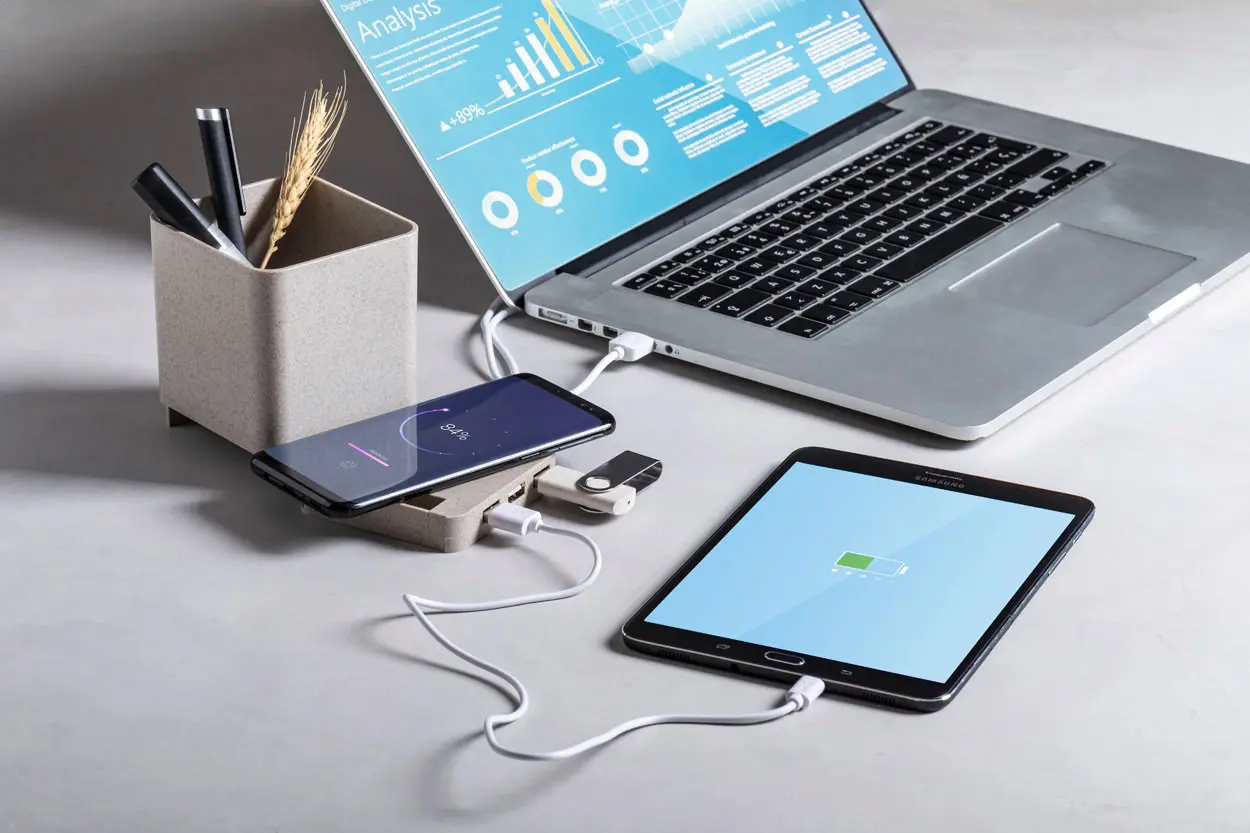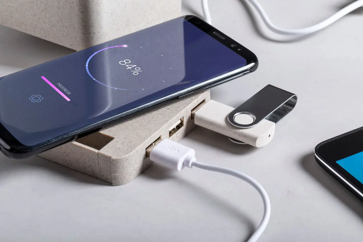€16.66Multifunkcionalni držač za olovke od ekološke plastike od pšenične slame s držačem za mobitel, bežičnim punjačem (5W) i USB hubom s 3 priključka (USB 2.0). Uključuje USB kabel za punjenje.