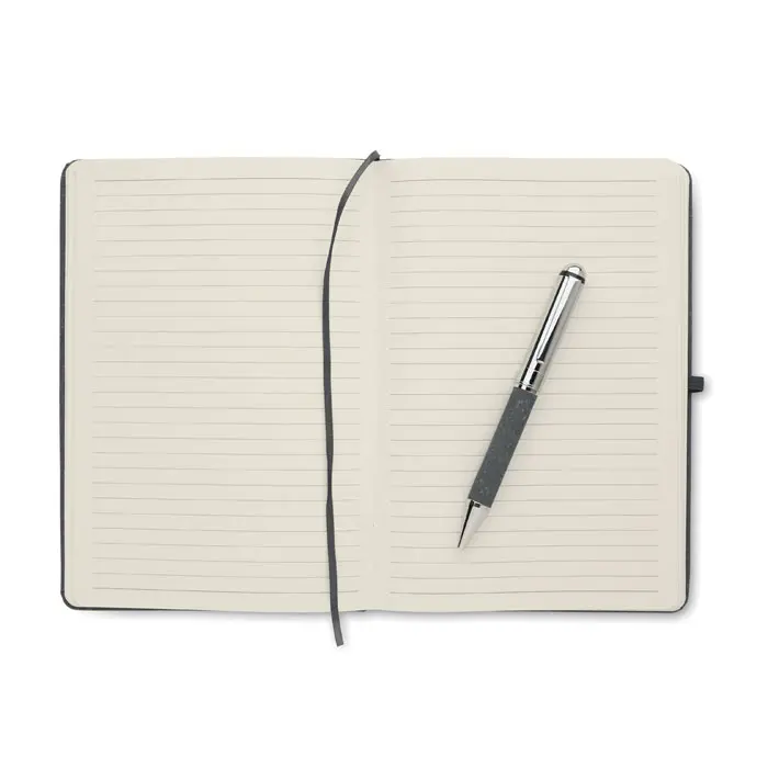 €5.72Poklon set. Reciklirana koža (75%) A5 bilježnica s tvrdim koricama. Ukoričena. 160 stranica s linijama izrađenih od recikliranog papira (80 listova). Odgovarajuća elastična traka za zatvaranje, vrpca za označavanje stranica i držač za olovku. Odgovarajuća metalna olovka na uvrtanje. Plava tinta. Predstavljeno u kutiji od kraft papira. FSC® certificirano | FSC MIX CREDIT, P7.1, FSC-C213206