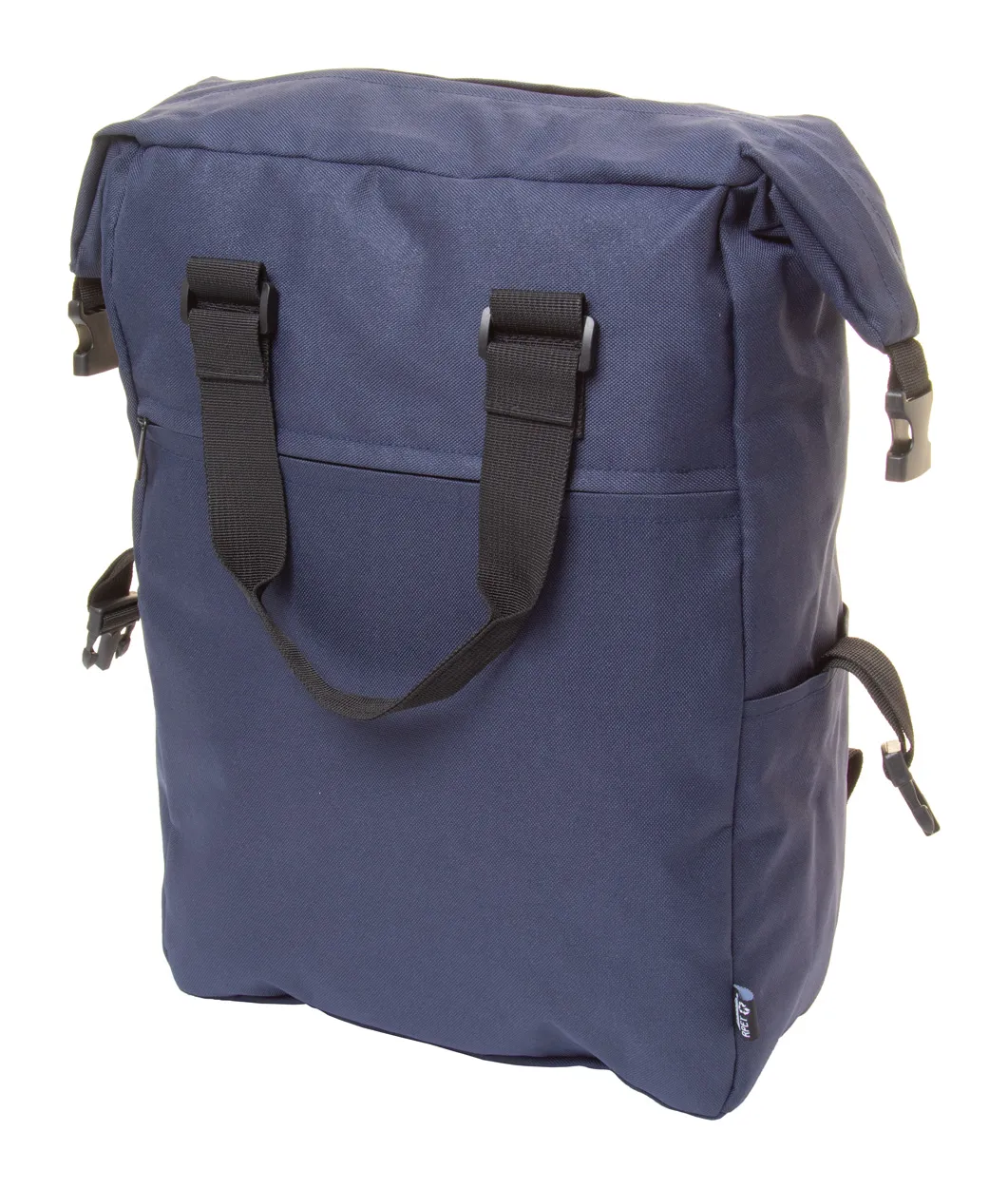 €27.01RPET ruksak s glavnim pretincem na patentni zatvarač i prednjim džepom, podstavljenim pretincem za laptop (15\) i tablet (10\"), bočnim remenima i džepovima, podstavljenim leđima i naramenicama, izrađen od 600D RPET poliestera s prepoznatljivom RPET etiketom"