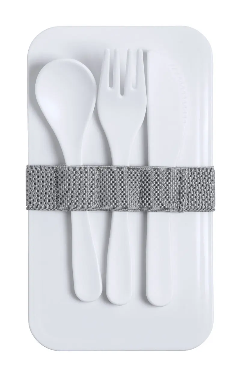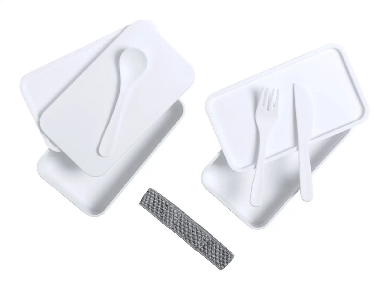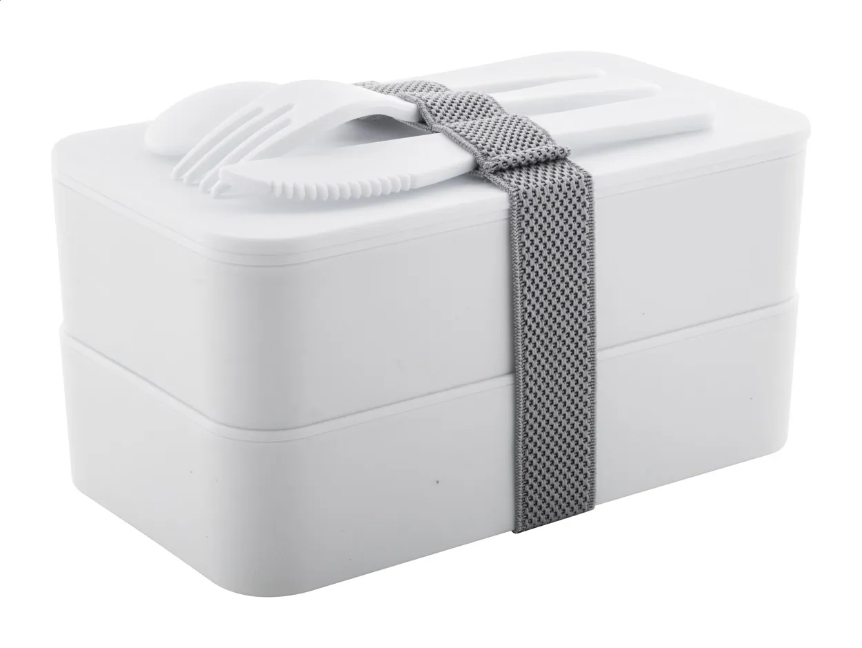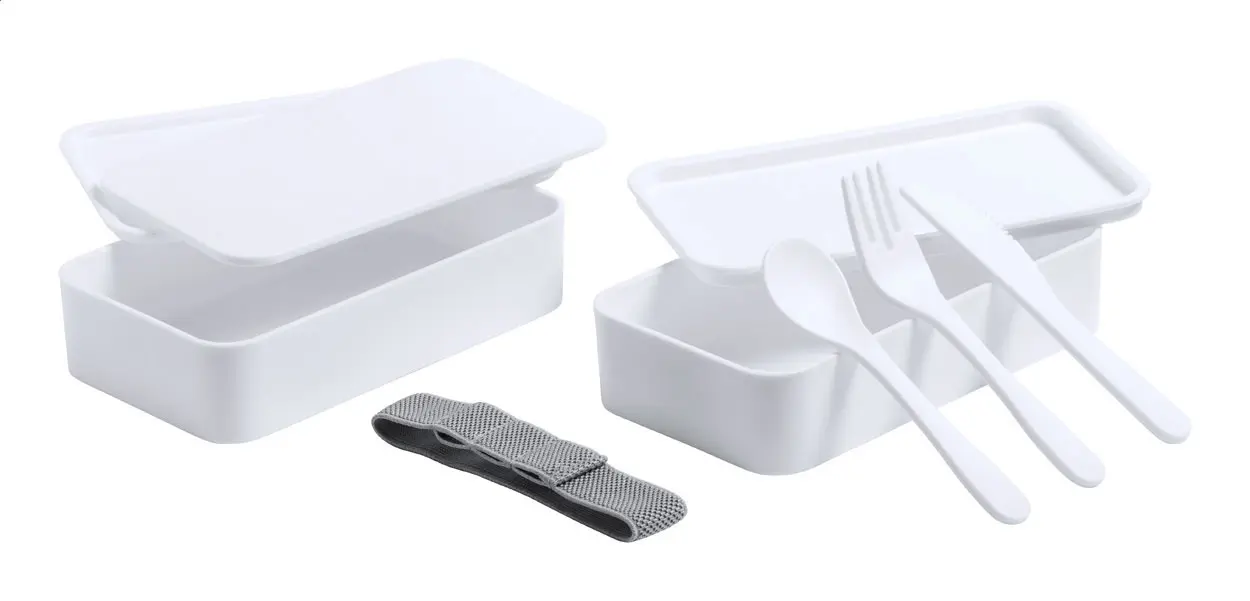 Lunch box od antibakterijske plastike s priborom za jelo (vilica, žlica i nož) i elastičnom trakom s 2 pretinca kapaciteta po 700 ml ISO 22196 sukladno