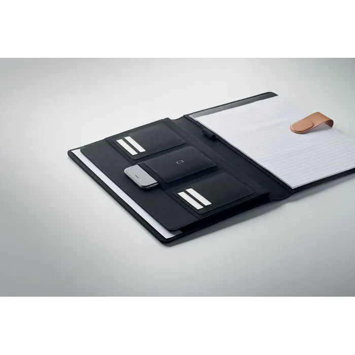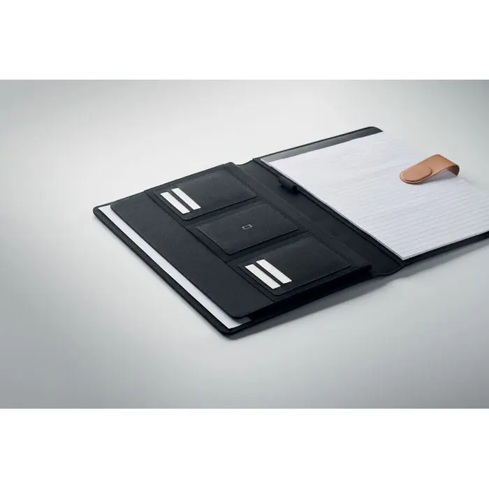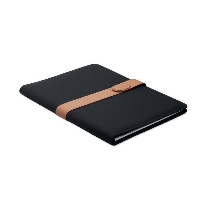 €12.08A4 portfolio od RPET-a s detaljima od umjetne kože. Zamjenjiva A4 bilježnica. 30 stranica s linijama od recikliranog papira. Držač za olovku. 4 držača za kartice, 3 mala džepa i jedan veliki pretinac. Magnetsko zatvaranje s remenom. FSC®-certificiran | FSC MIX, P8.6, FSC-C213206