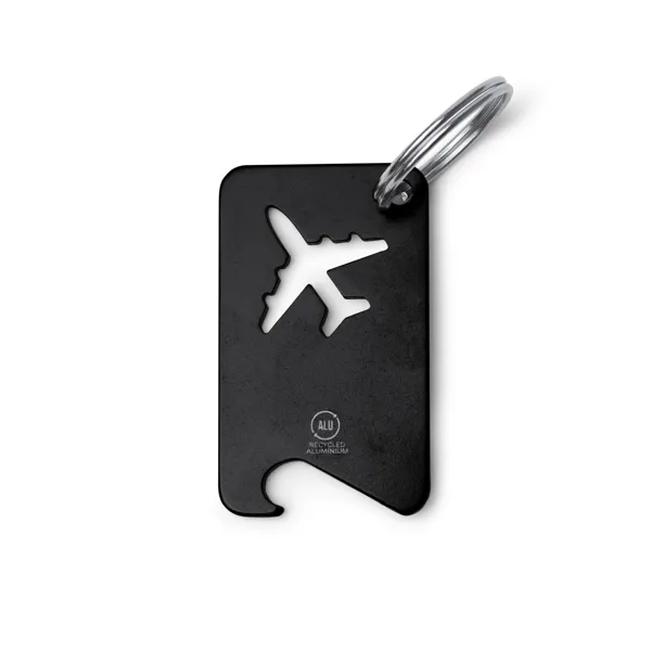 Recycled aluminium keyring with bottle opener. Die-cut design in the shape of an airplane.