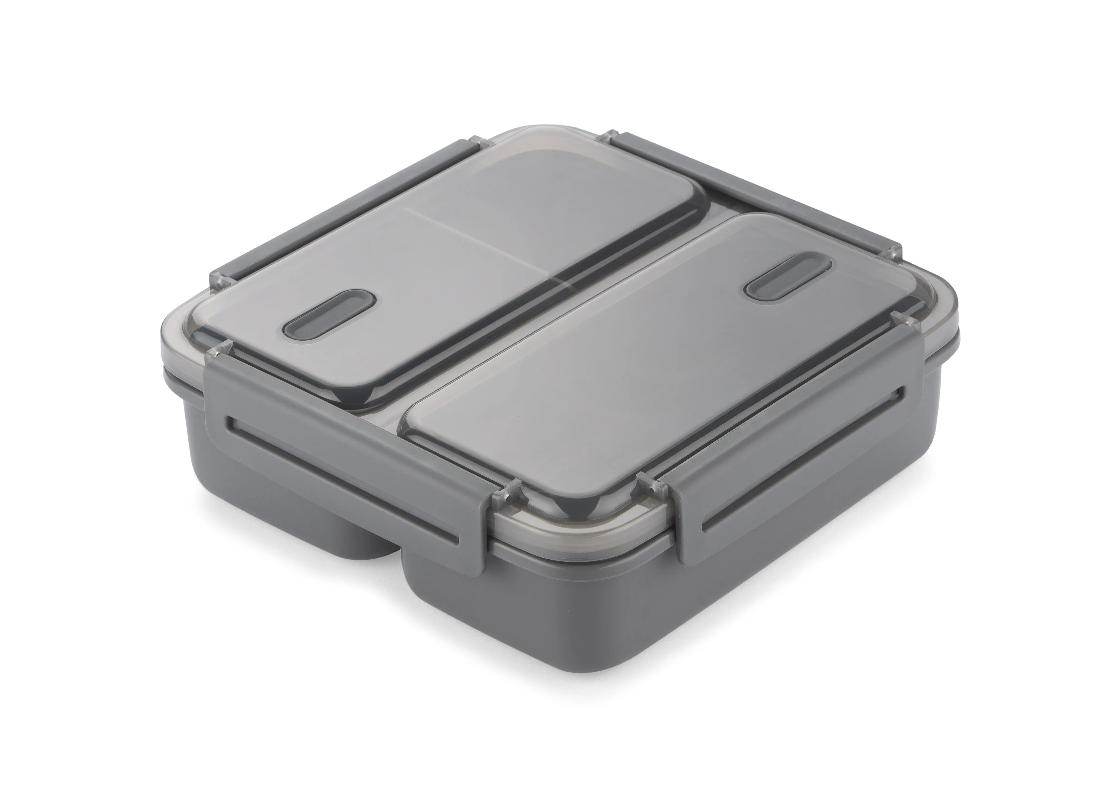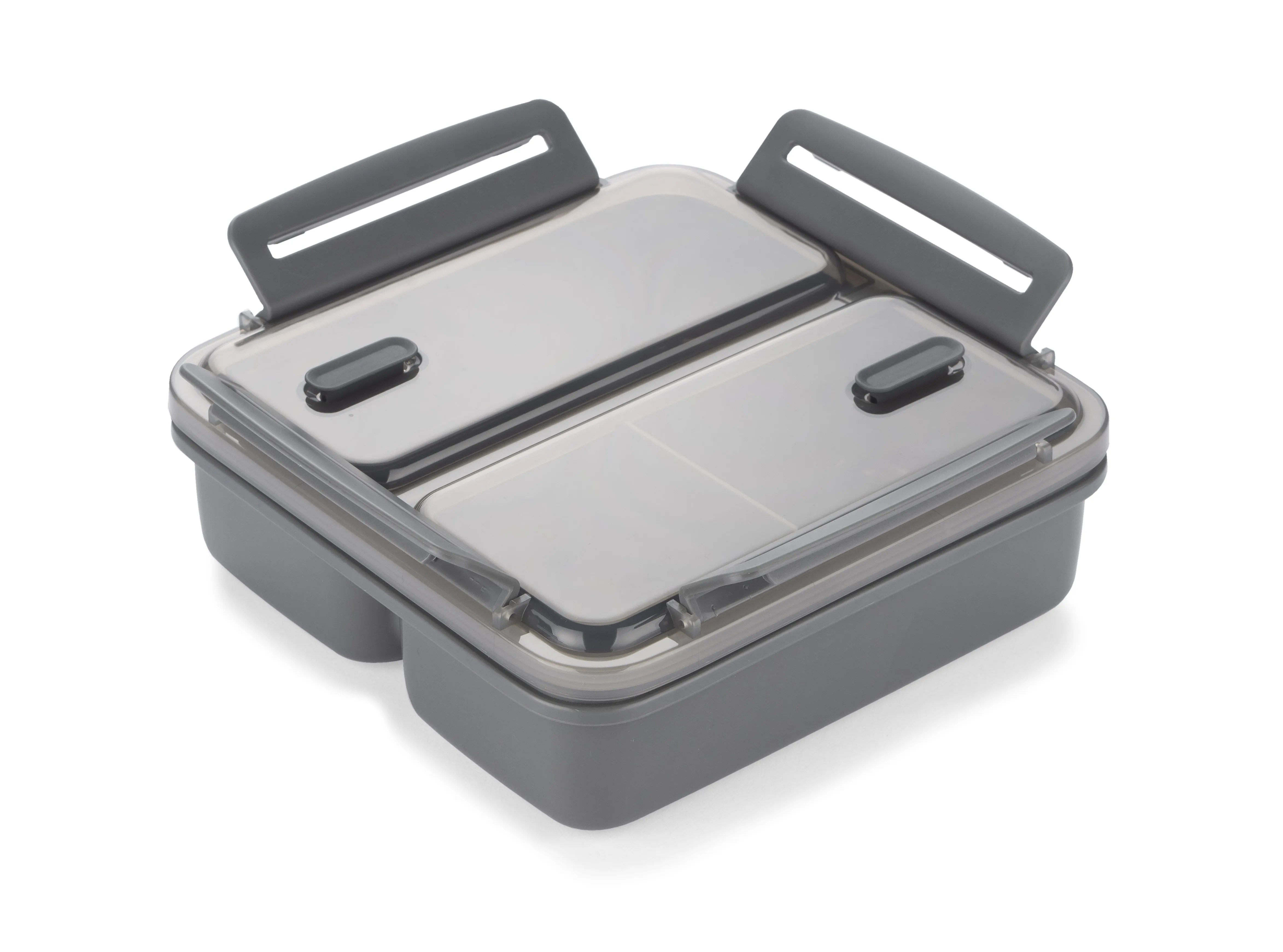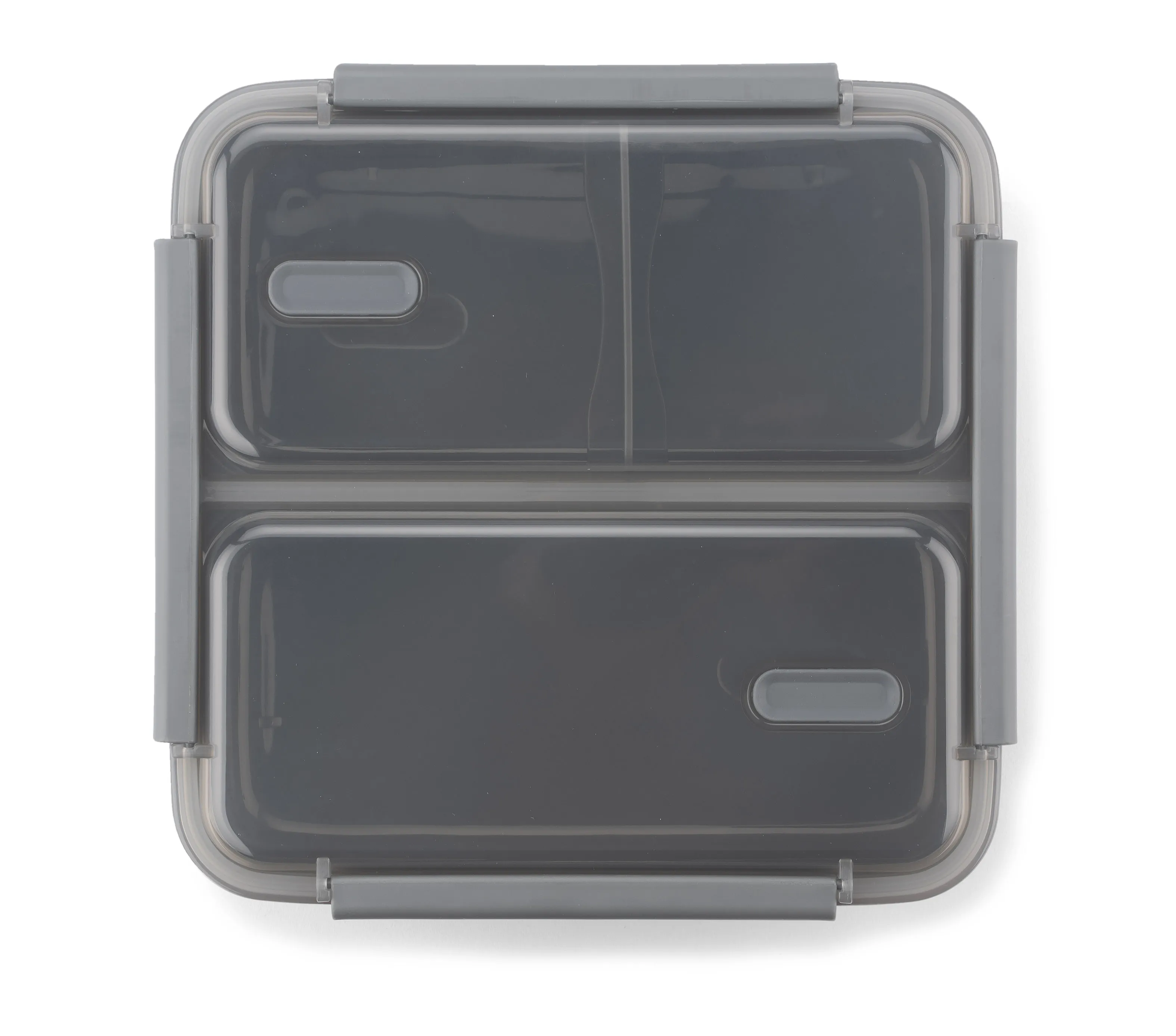 DUO lunch box s dva glavna pretinca i dodatnim odvojivim separatorom, brtva u poklopcu, zatvaranje s četiri kopče, kapacitet 1100 ml, izrađen od polipropilena sigurnog za kontakt s hranom