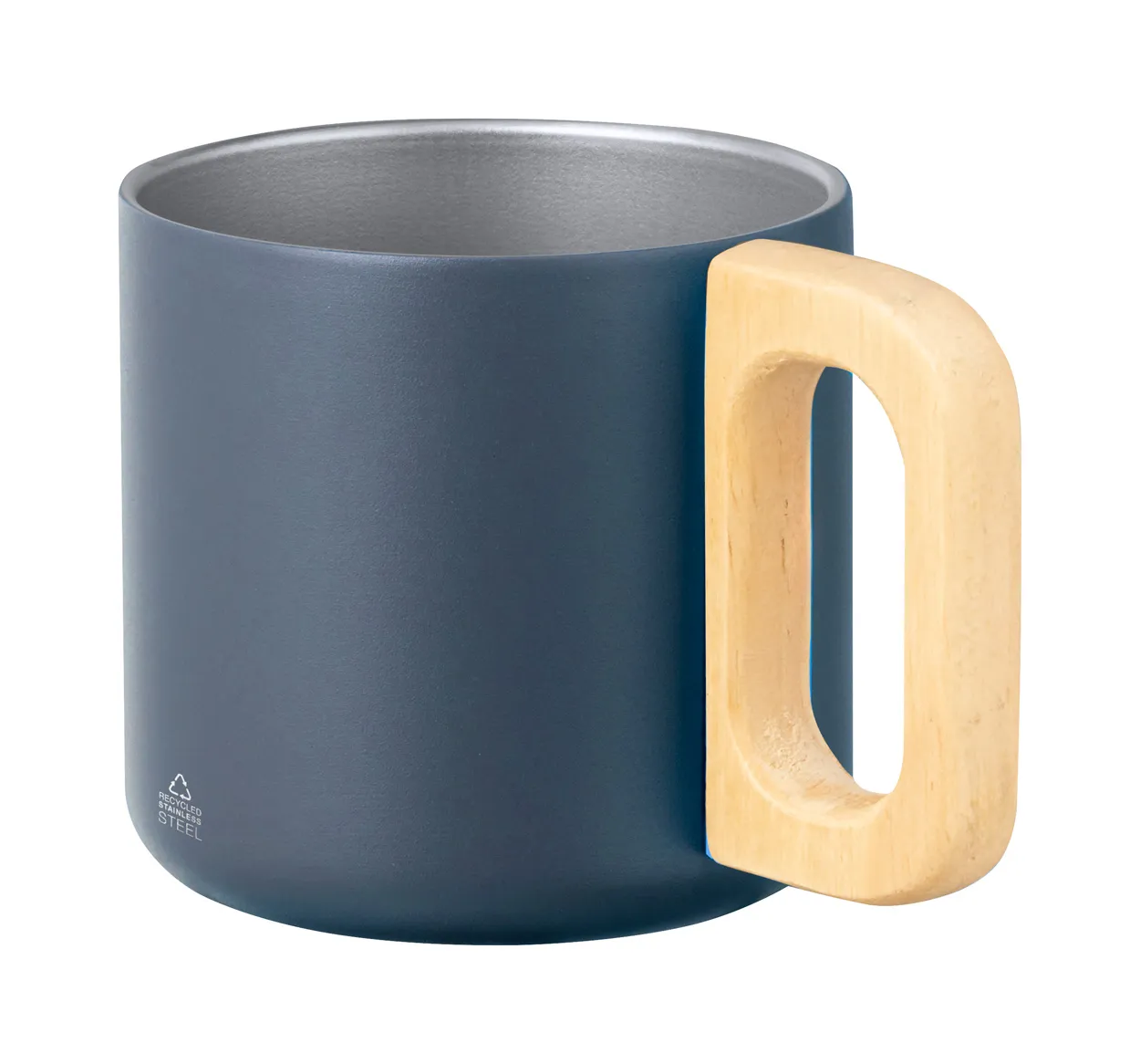 Termo šalica od recikliranog nehrđajućeg čelika s dvostrukim zidom i drvenom ručkom, 400 ml.
