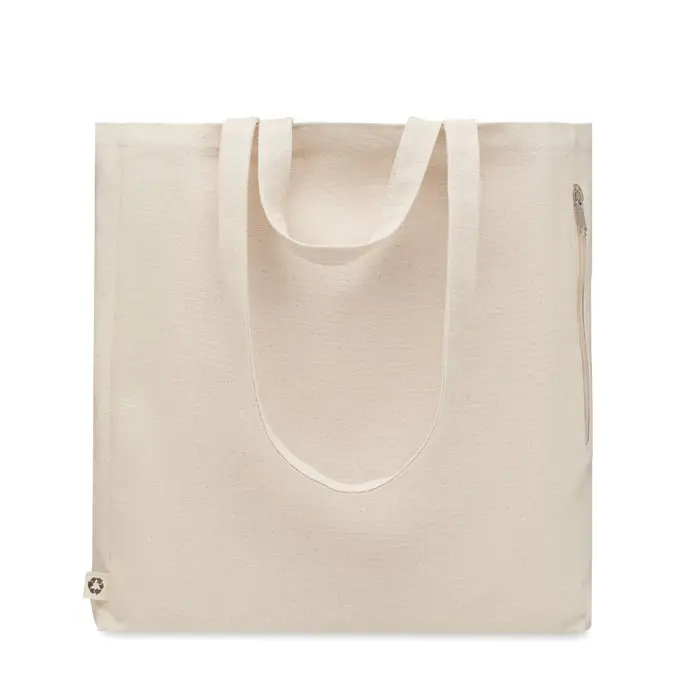 €4.73Recycled polycotton shopping or beach bag (70% recycled cotton, 30% recycled polyester) with short and long handles. It has a side zippered pocket. 380 gr/m².