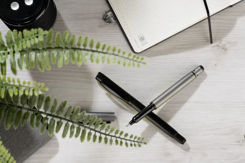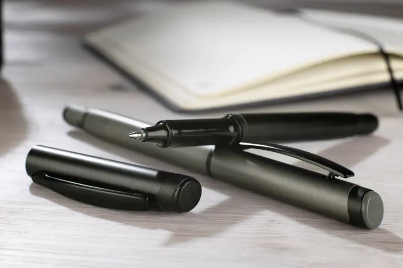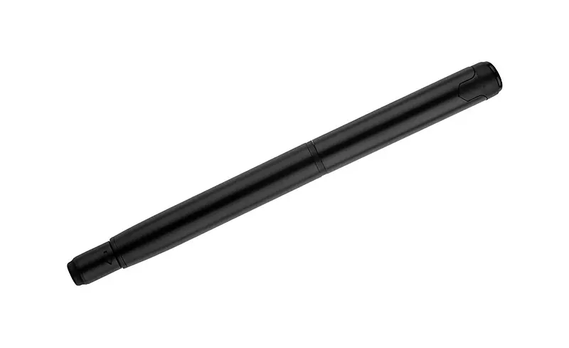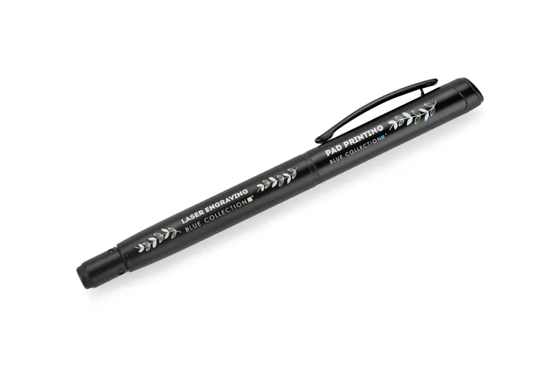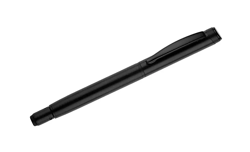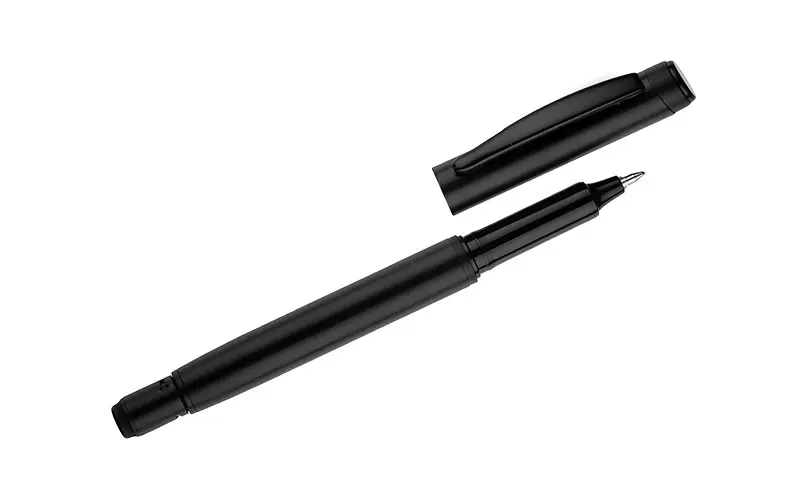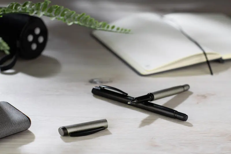 €2.16ROTIS kemijska olovka je aluminijski model s punjenjem od gela bez tinte, zatvoren klasičnom kapicom. Polu-matirana cijev je upotpunjena crnim metalnim klipom, što dodaje elegantan dodir. Rotirajući vrh s integriranim spinnerom služi kao anti-stres funkcija - crna strelica utisnuta u materijal na vrhu suptilno sugerira smjer rotacije.